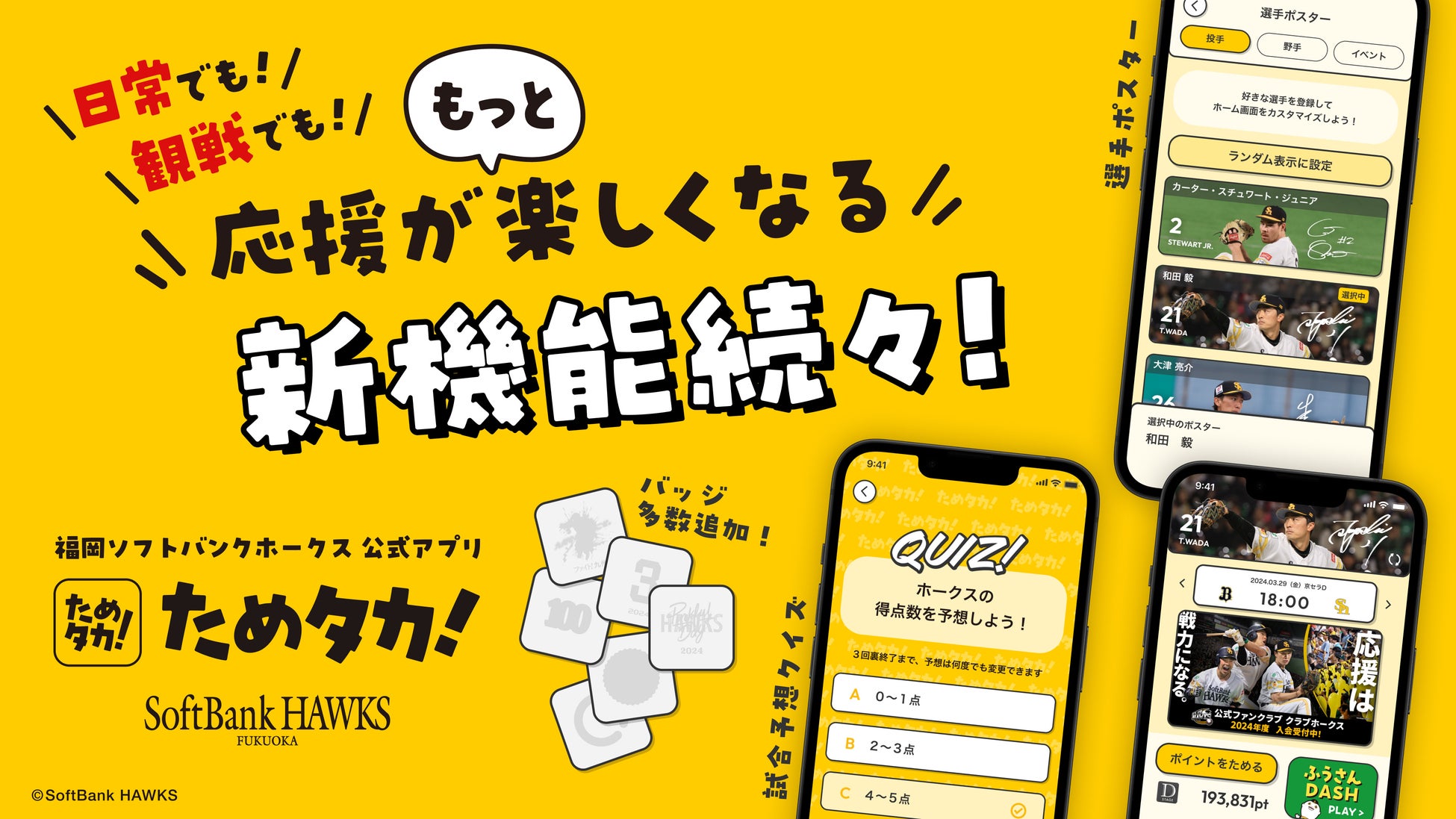 この度「ためタカ!」が24年シーズン開幕に向け、バージョンアップを行いました。より多くの方々に楽しんでいただけるように、試合展開を予想してタカポイントがもらえる「試合予想クイズ」や、お気に入りの選手でアプリを着せ替えられる「選手ポスター」など、ホークスの応援がもっと楽しくなる新機能を追加いたしました。
