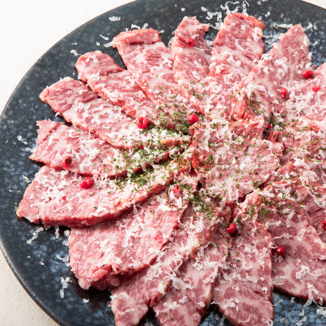 大きく育ちきらなかったために市場に出回る機会がなかった黒毛和牛の希少部位“ザブトン”部分を使用。そのまま生で食べていただくと黒毛和牛の上質な脂の旨味をお楽しみいただけます。