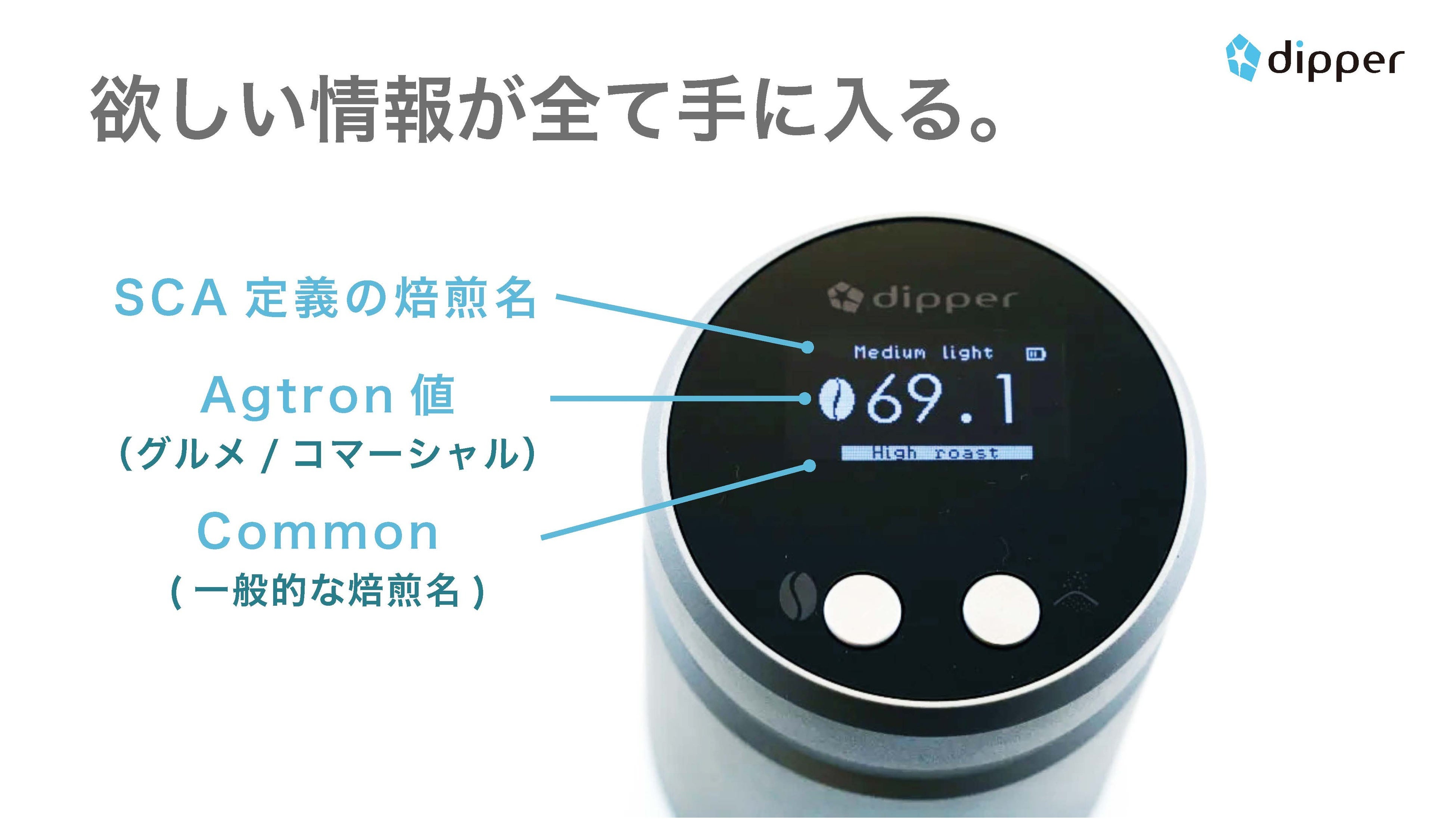 dipperが表示する数値は、アメリカのSCAも採用する、コーヒーのプロが用いるアグトロン値です。普段から焙煎やカッピング等でアグトロン値に慣れているプロの方は引き続きSCA基準で業務が可能であり、一般の方もプロと同じ数値基準を使ってお手持ちのコーヒー豆の焙煎度合いをカンタンに知ることが可能です。