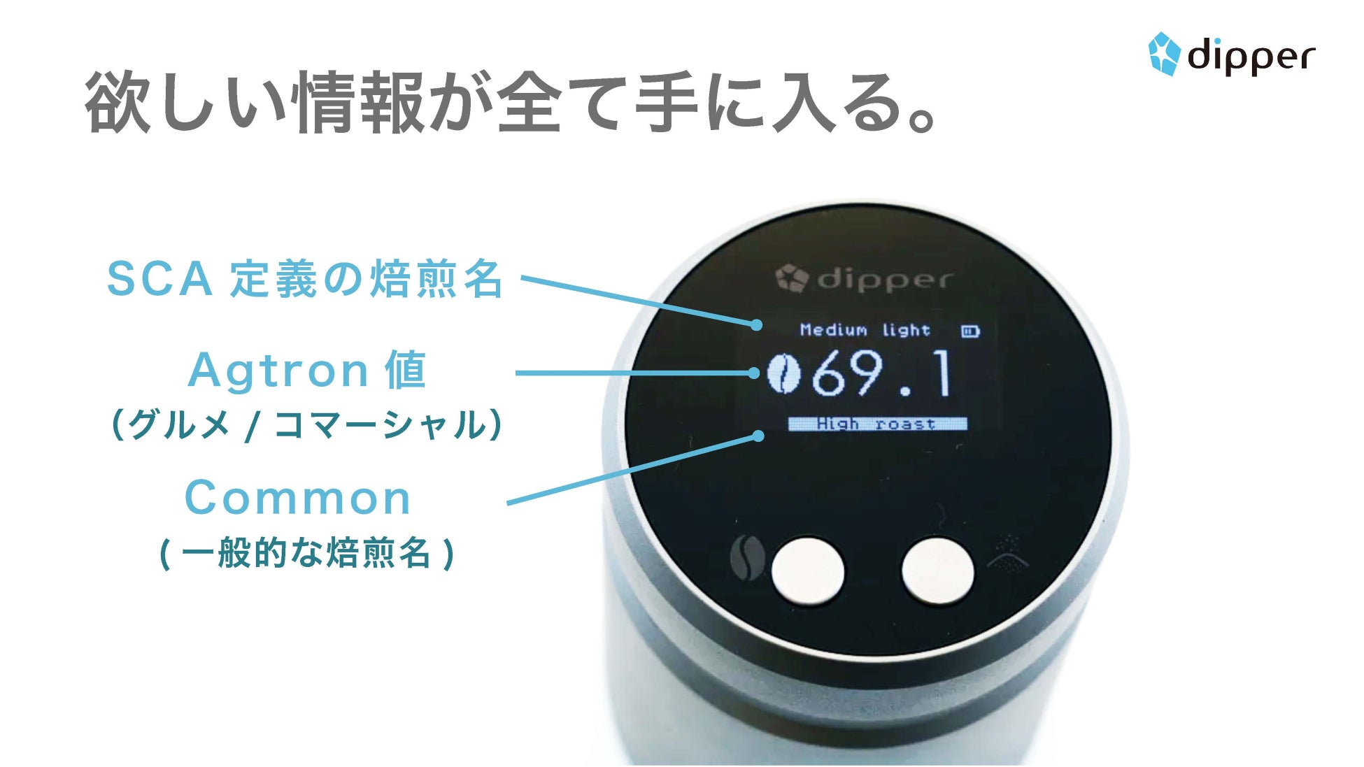 dipperは⽶国Agtron社と同様の測定原理を採⽤し、色を測る方法ではく780〜1500nm波⻑の可視光に近い近赤外線でコーヒーの炭化程度に応じた反射量を計測し、米国SCA(Specialty Coffee Association・スペシャルティコーヒー協会)が採用している基準「アグトロン値」で焙煎度合いを表示します。
