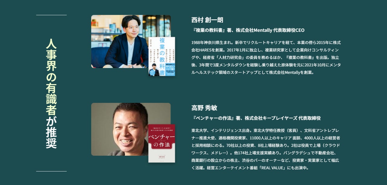 西村創一朗氏(『複業の教科書』著者)や高野秀敏氏(『ベンチャーの作法』著者)など、ビジネスの第一人者からも推薦をいただいています。また修了後は、講師や推薦者との交流イベントや卒業生コミュニティに参加可能です。