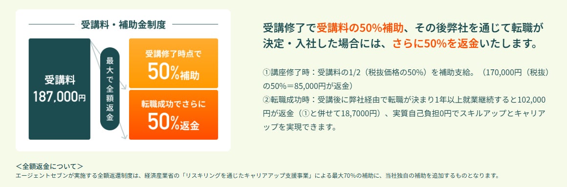 リスキリングを通じたキャリアアップ支援事業: 当事業を受講し所定のカリキュラムを修了すると、受講費用の50%が補助されます。