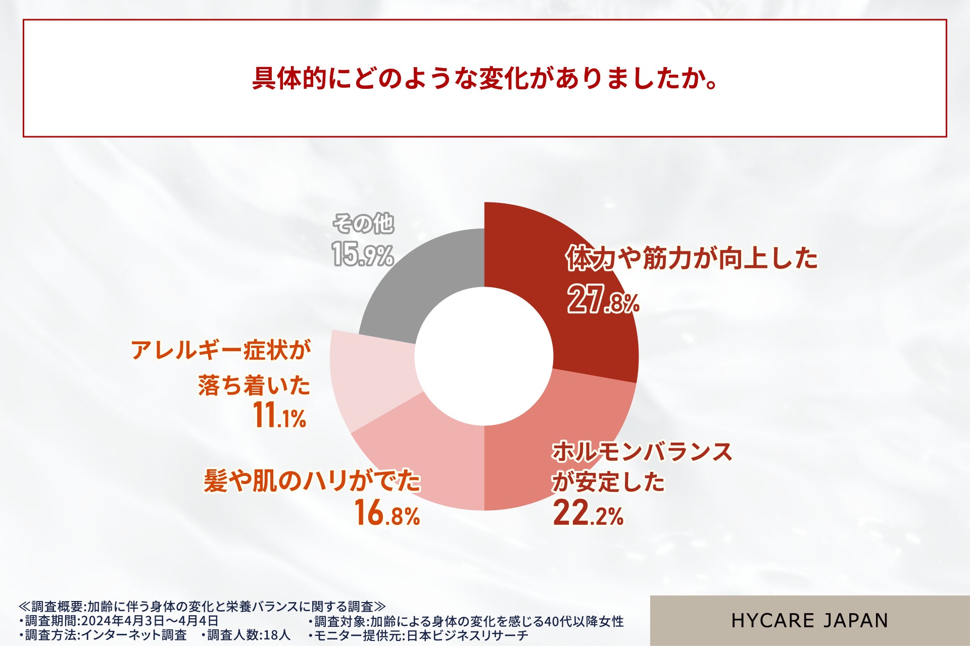 最も多かったのが「体力や筋力が向上した」で27.8%でした。次いで多かったのは順に「髪や肌のハリがでた(22.2%)」、「ホルモンバランスが安定した(16.7%)」、「アレルギー症状が落ち着い(11.1%)」と続きました。