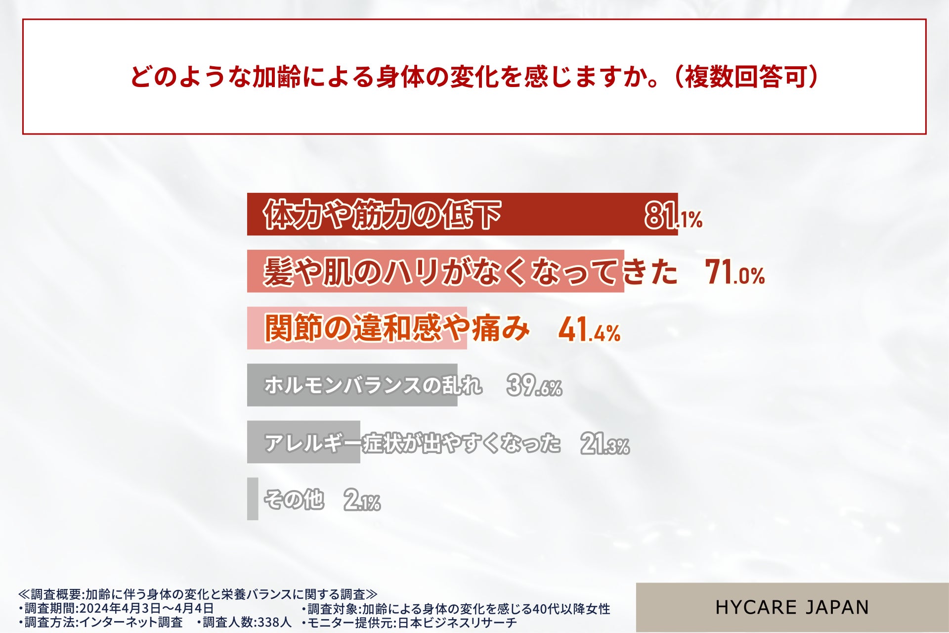 今回の調査により、40代以降の女性が加齢により複数の身体の変化を感じていることが明らかになりました。