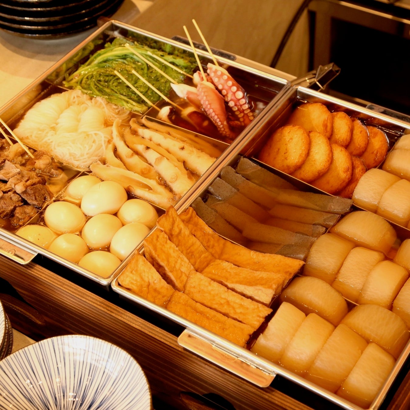 大根・ちくわ・こんにゃく・玉子・厚揚げ・平天・結びしらたき・餅巾着・菊菜・たこ