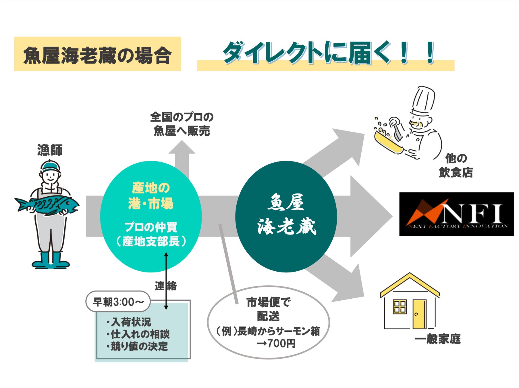 産地、漁場、漁師がこだわり、絞め方にもこだわった鮮魚が直接届く仕組み。