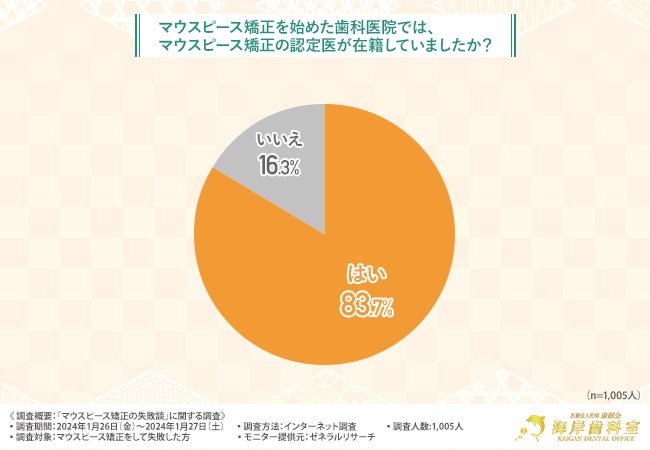 「マウスピース矯正を始めた歯科医院では、マウスピース矯正の認定医が在籍していましたか?」と質問したところ、約8割の方が『はい(83.7%)』と回答しました。