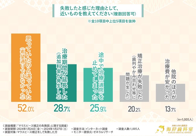 はじめに、「失敗したと感じた理由として、近いものを教えてください(複数回答可)」と質問したところ、『思っていたのと違っていた(希望通りではなかった)(52.0%)』と回答した方が最も多く、次いで『治療期間が延長した(追加料金が発生した)(28.7%)』『途中で治療(通院)を止めてしまった(25.9%)』と続きました。