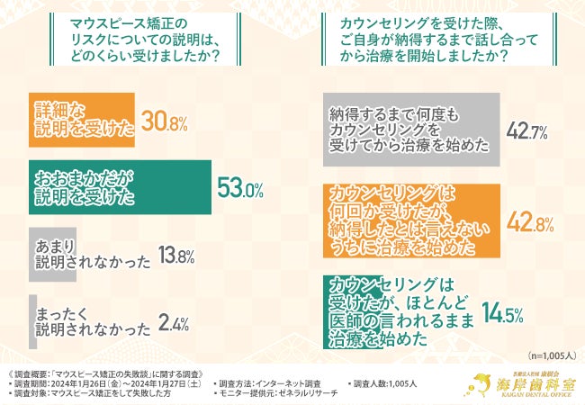 約8割の方がマウスピース矯正のリスクについて説明を受けたと回答しましたが、納得しない点や疑問点が解消されないままに治療をスタートした方が多いことも明らかになりました。