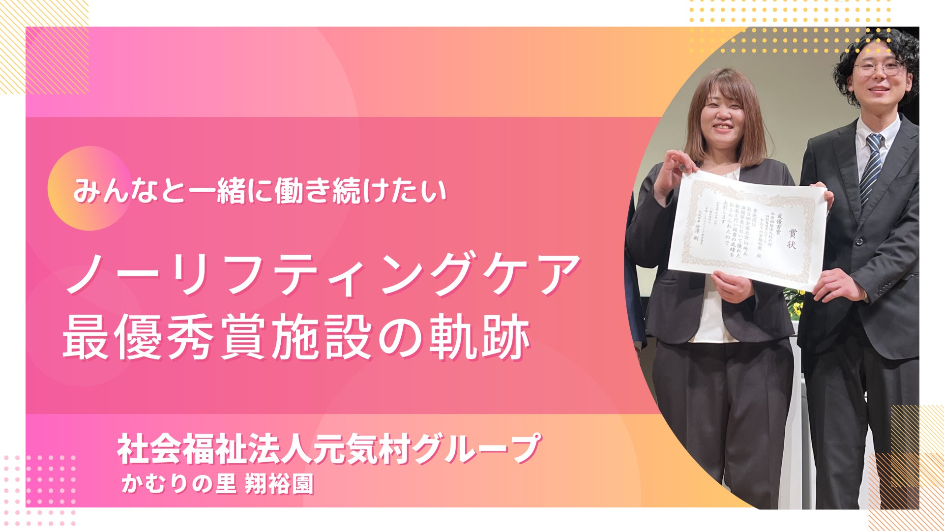 社会福祉法人元気村グループ(本社:埼玉県さいたま市、代表:神成 裕介)が運営する高齢者福祉・障害福祉サービス事業所「翔裕園」。そのグループ内施設の一つである「かむりの里翔裕園 (宮城県仙台市)」にて、介護職員の腰痛対策としてノーリフティングケアの浸透を進め、働きやすさの向上とケアの質向上に成功した。2023年11月2日に行われた、一般社団法人 全国ノーリフティング推進協会主催の『第9回全国大会in埼玉』では、最優秀賞を受賞するなど、その取組みの質も評価された。職員の年代変化に伴い、推進の中心となる職員が福祉用具の必要性を訴え、施設内研修を行い全体の理解を深めた。浸透を進めていくにあたり、ご利用者一人ひとりに合わせたケアの統一を図る事で、自立支援やケアの質向上にも繋がり、2023年度現在の離職率は常勤・非常勤合わせて1.3% (退職者1名)を実現した。