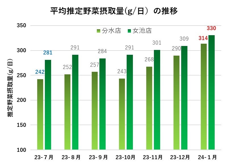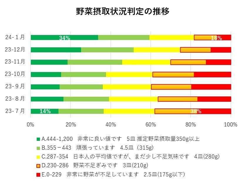 またA~Eの5段階評価で見ますと、A判定(推定野菜摂取量350g以上)の割合は7月の時点では14%でしたが、1月は34%と20ポイント上昇し、日本人の平均野菜摂取量より低いD判定とE判定の割合が38%から18%と20%ポイント大きく減少しました。