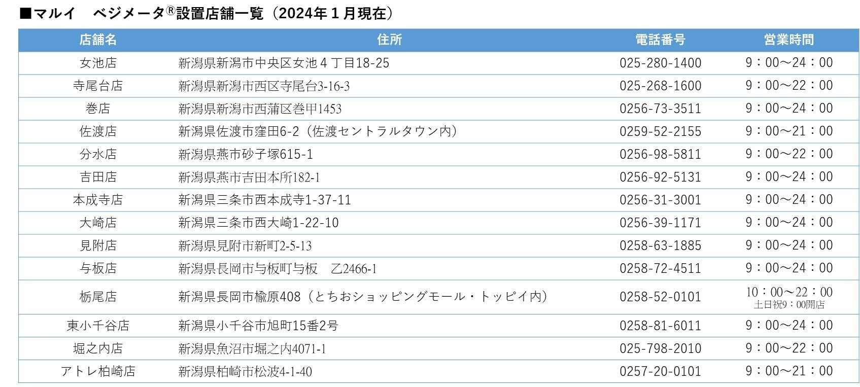 株式会社マルイ(本社:新潟県見附市、代表取締役社長 清水 辰雄)様は、2023年7月に新潟県で初めてベジメータProを2店舗に導入し、顧客の野菜不足改善に取り組まれてきましたが、この度、その効果が確認されたことを受けて、2024年1月までに追加で12店舗にベジメータProが設置されました。