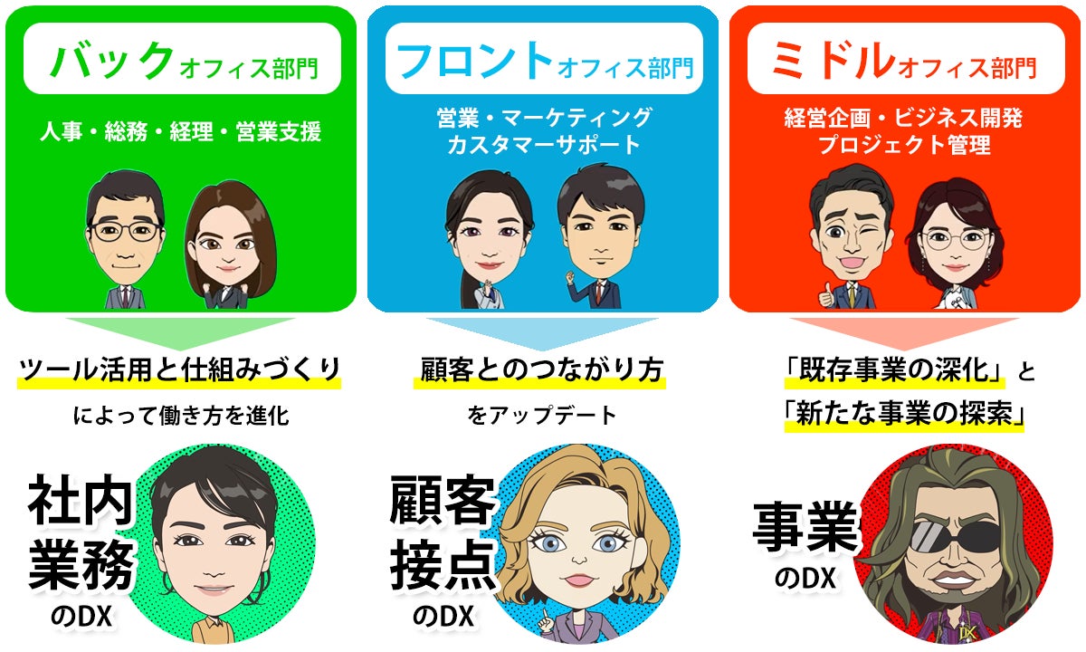 机上論ではなく、企業によくある3つの部門「バックオフィス(総務・人事系)」「フロントオフィス(営業系)」「ミドルオフィス(戦略・企画系)」とDX3つのテーマ「社内業務」「顧客接点」「事業」を掛け合わせ、自業務での推進をイメージしやすいように構成。“行動に移せる学び”を提供しています。