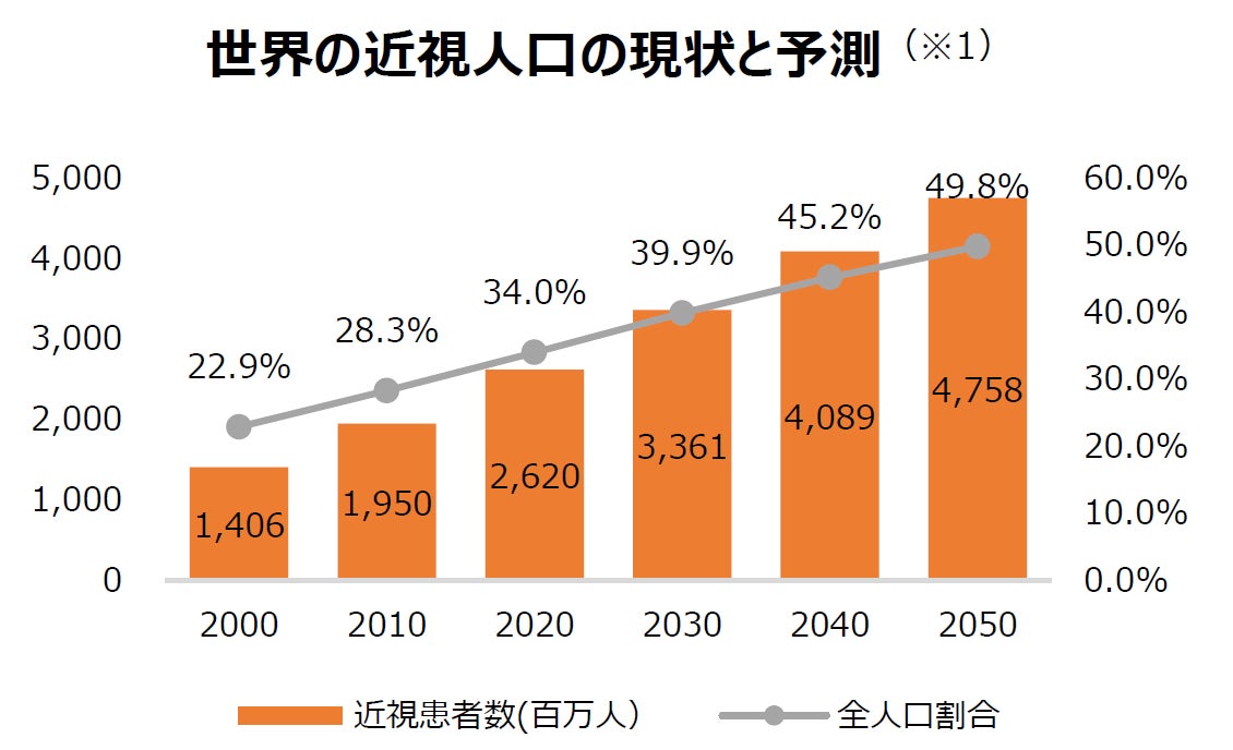スマートフォンの普及に伴い、国内では約4,000万⼈が近視と推定されています。この動きは世界でも同様で、2050年には世界⼈⼝の約半分が近視になるとも試算されており、10億⼈が失明リスクを負うとも予想されています(※1)。