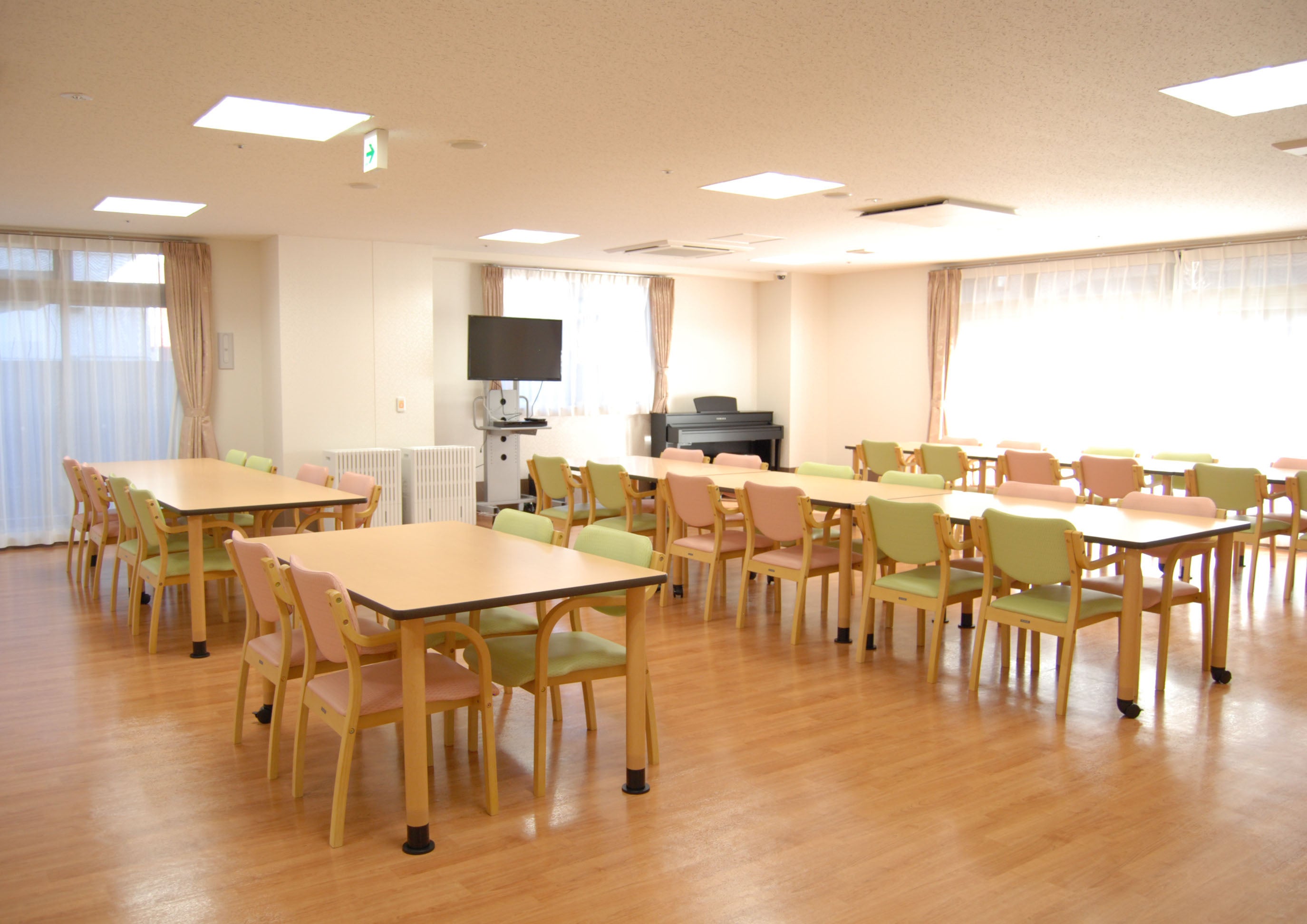共用設備/食堂、浴室(一般浴・機械浴・個浴)、健康管理室、ヘルパーステーション、談話コーナー、ファミリールーム、理美容室、相談室、事務室、洗濯室、トイレ、エレベーター