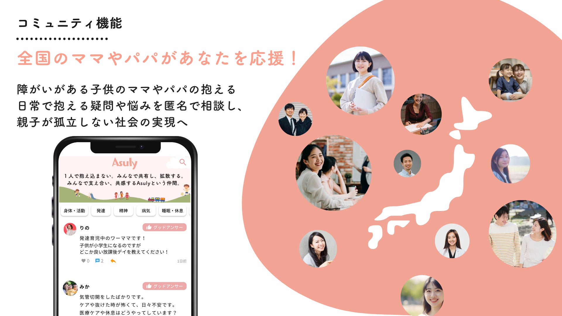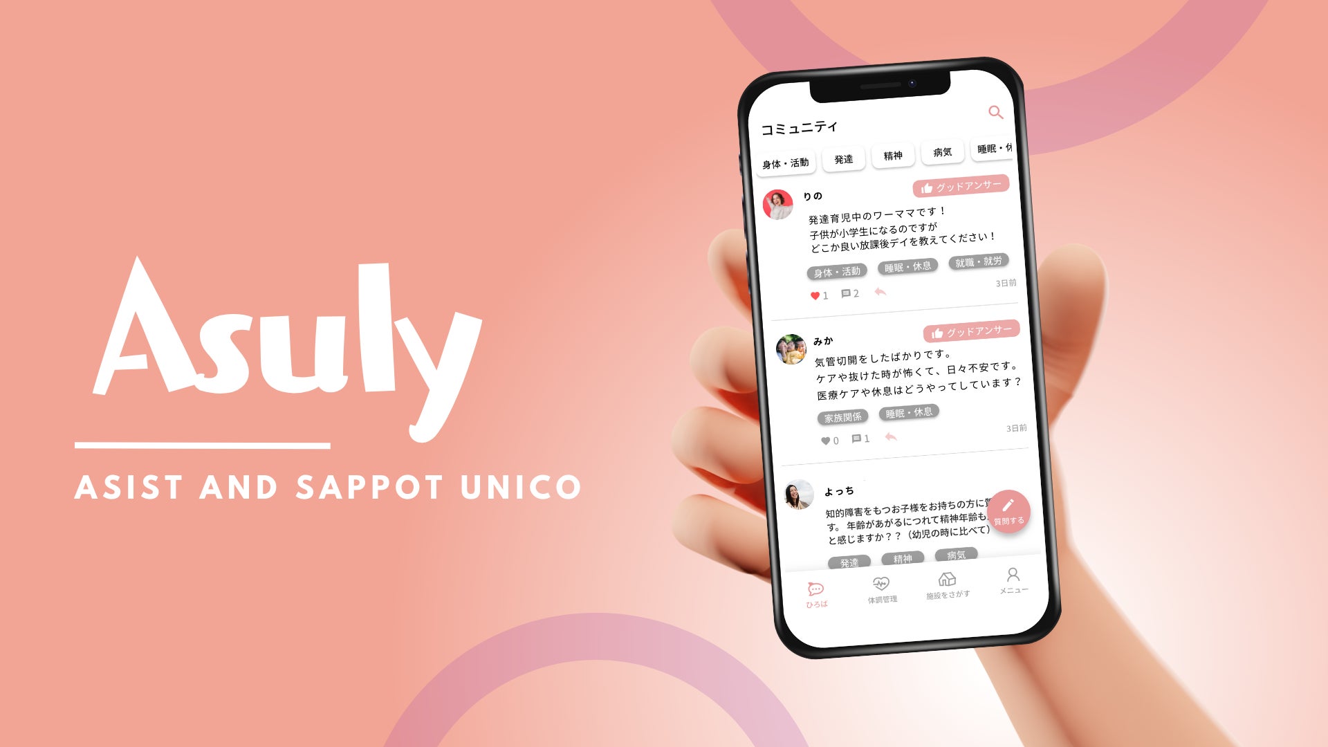 Asulyのコミュニティ機能は、同じ悩みを持ったコミュニティに自分の悩みを拡散し、共有・解決ができます。