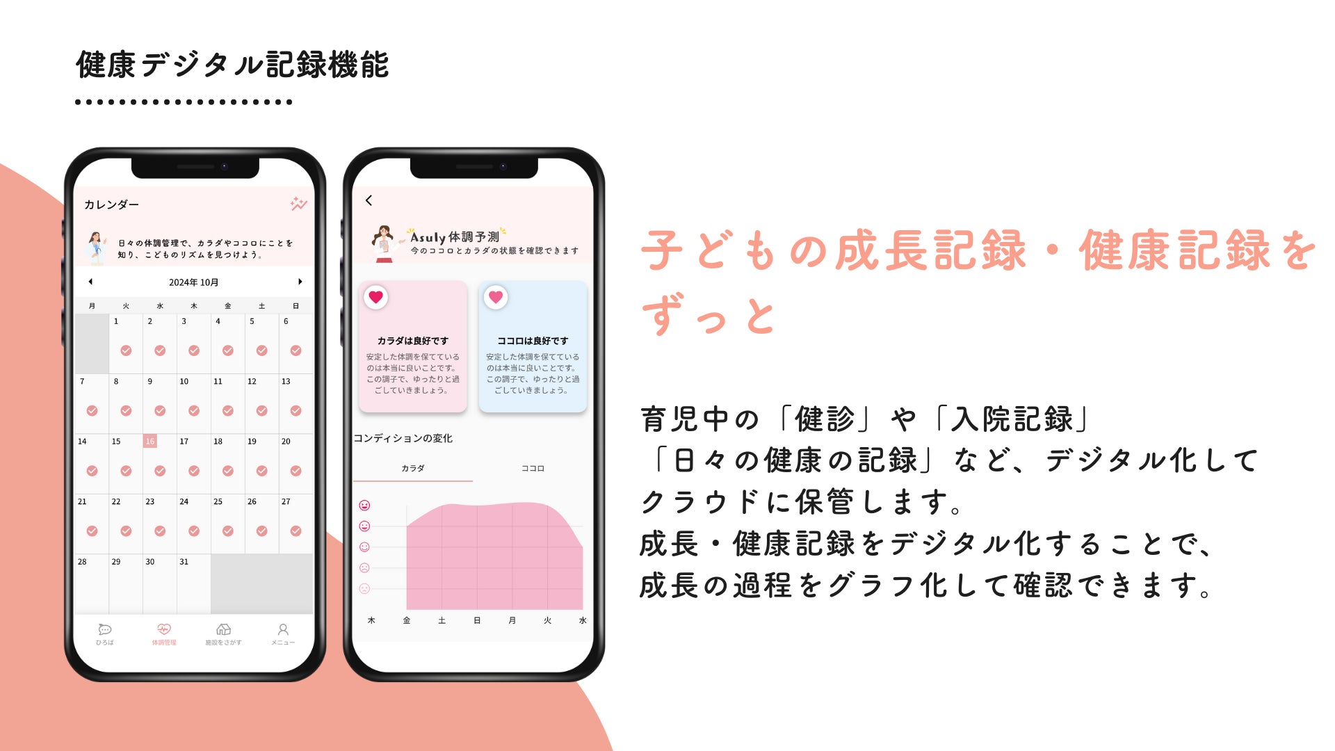 記録した健康記録はデジタルで保存され、見返すことができ、適時医療従事者に共有ができるだけではなく、体調をグラフで可視化し、成長の過程を「見える化」し、いつでもどこでも確認ができます