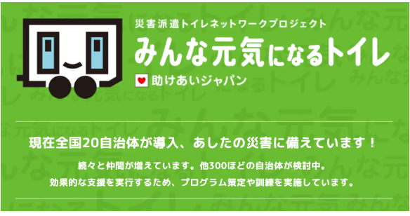 一般社団法人助けあいジャパンの災害支援トイレネットワークプロジェクト「みんな元気になるトイレ」は、安心・安全・清潔なトイレを被災自治体にお届けし、避難者・ボランティアなどトイレが使えない近隣住民・自衛隊や医療関係者などの支援のプロに使用いただき、排泄のストレスを感じることなく復興への道のりを支えるものです。一度出動すると短くて一月、長くて半年ほど無償貸与させていただいています。2018年プロジェクト発足以来、日本中多くの被災自治体へ出動支援をしてきました。