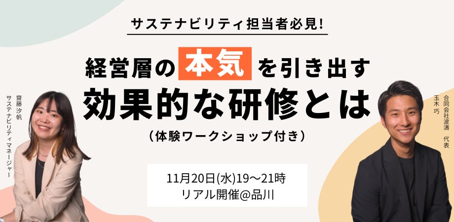 サステナビリティの社内浸透を支援する合同会社波濤(所在地:大阪市北区、代表社員 玉木巧)は、2024年11月20日(水)に 経営層の本気を引き出す効果的な研修とは(体験ワーク付き) を品川駅近郊で開催いたします。