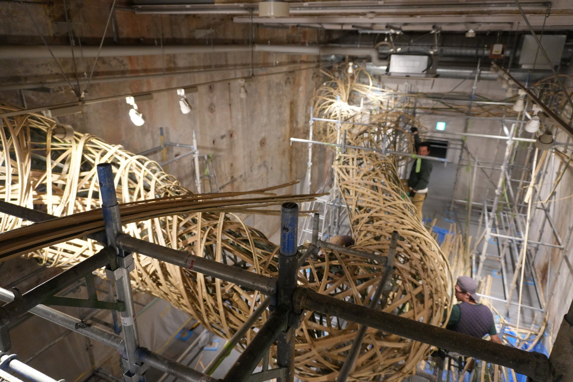 ただいま、竹のインスタレーションを手がける専門チームによる、鰻をモチーフとした空中モニュメント制作の真っ最中。知多半島の竹林から間伐してきた8〜9メートルの竹260本ほどを割いた約2000本を使用しています。使用した竹は展示後、炭にして活用する予定。迫力の空中展示は階段を登って上から見下ろすことも可能。上から覗き込むと、シラスのイラストプレートのなかに紛れたカニやエビを発見する楽しみもあります。