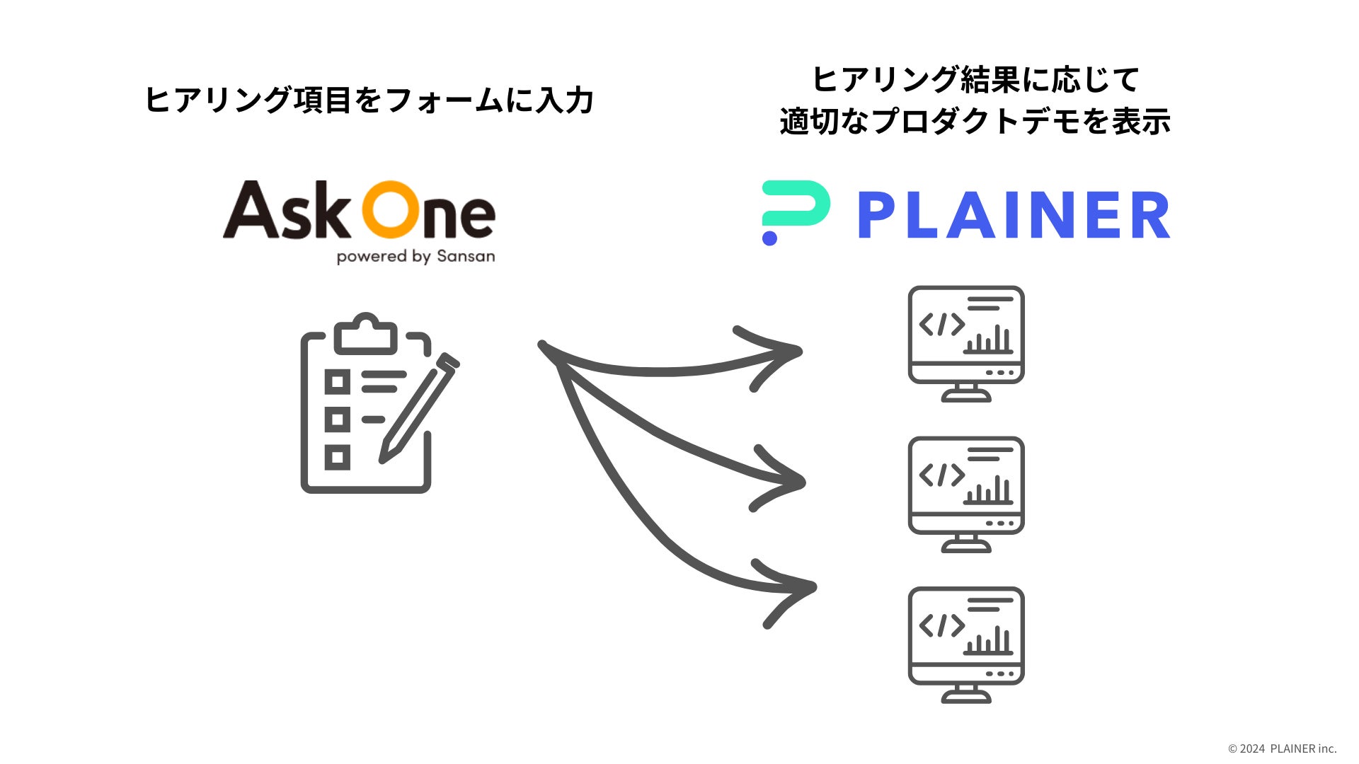 お客様に提示するPLAINERのプロダクトデモを、Ask Oneのフォームでのヒアリング結果に応じて自動的に出しわけることが可能となるため、フォームを進めていくだけで、顧客ニーズごとに最適なデモを提示することができ、提案の標準化と質の向上が実現されます。