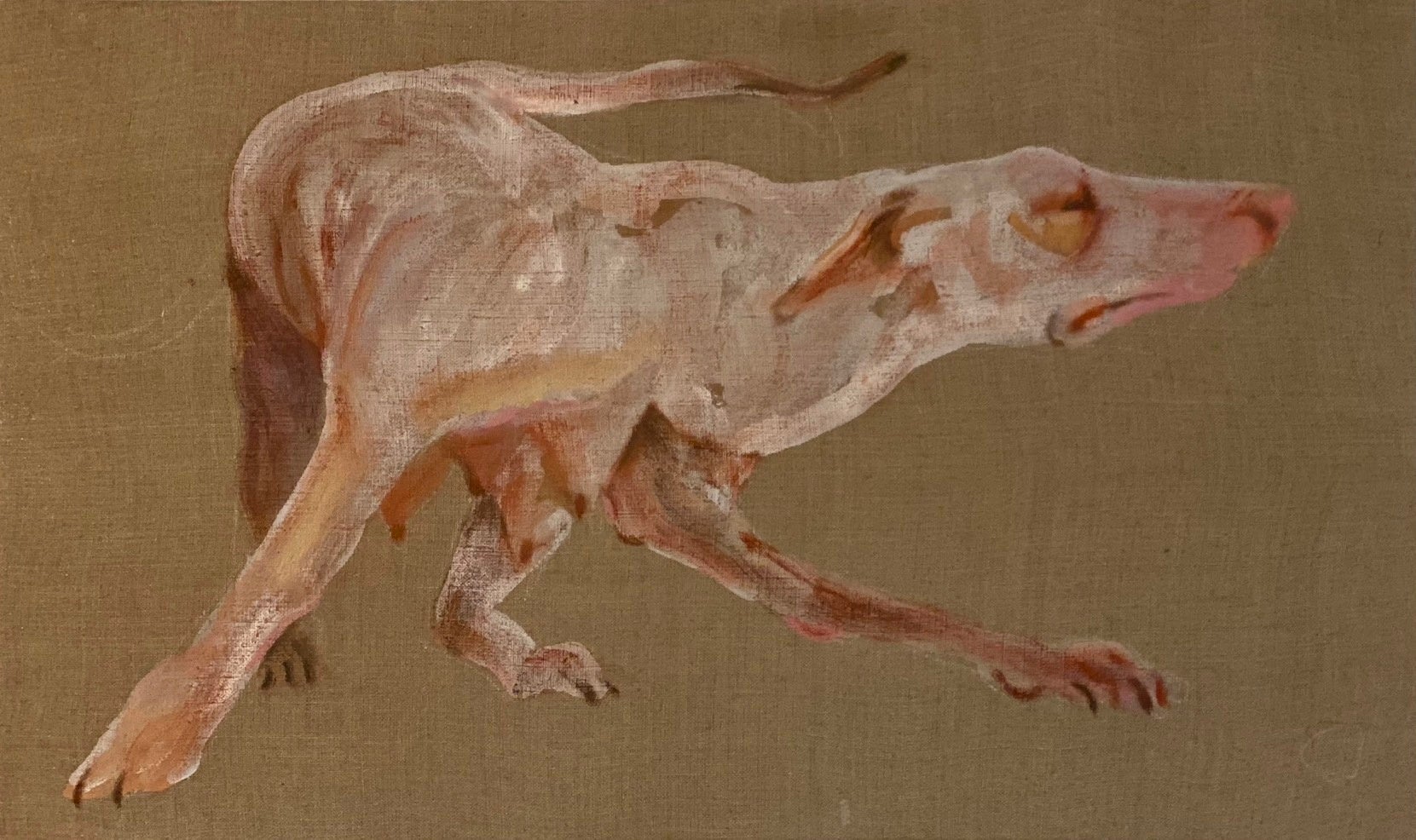 かすりのかかった伸びやかな筆致のストロークが、画面に動的な流れを生み出しています。重要なモチーフである犬は、大胆な構図で配置され、圧倒的な存在感と生命力を放っています。哲学的なテーマを扱いながらもユーモアさえ感じさせる生き生きとしたエネルギーに満ちています。