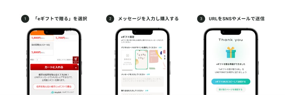 『AnyGift(エニーギフト)』は、相手の住所を知らなくてもLINEやメールで贈れる"eギフト機能"を、自社ECサイトに組み込み・導入ができるサービスです。