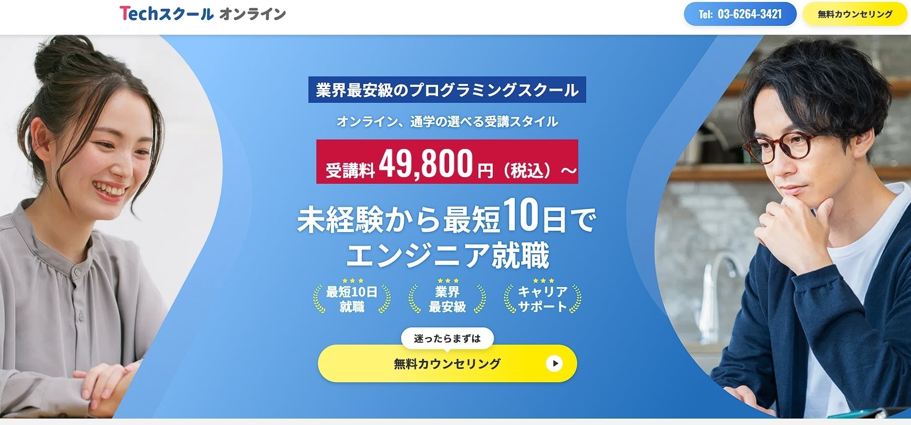 「Techスクールオンライン」は、オンラインと通学の受講スタイルから選べるプログラミング学習サービスで、未経験から最短10日でエンジニア転職を可能にする実践型の学習サービスです。サービス料金は業界最安級となる価格設定で49,800円(税込)となります。