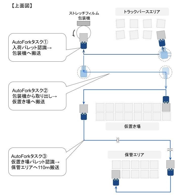 この実験で、荷受け作業後の倉庫内への搬送を「AutoFork」により自動化できることが実証されました。