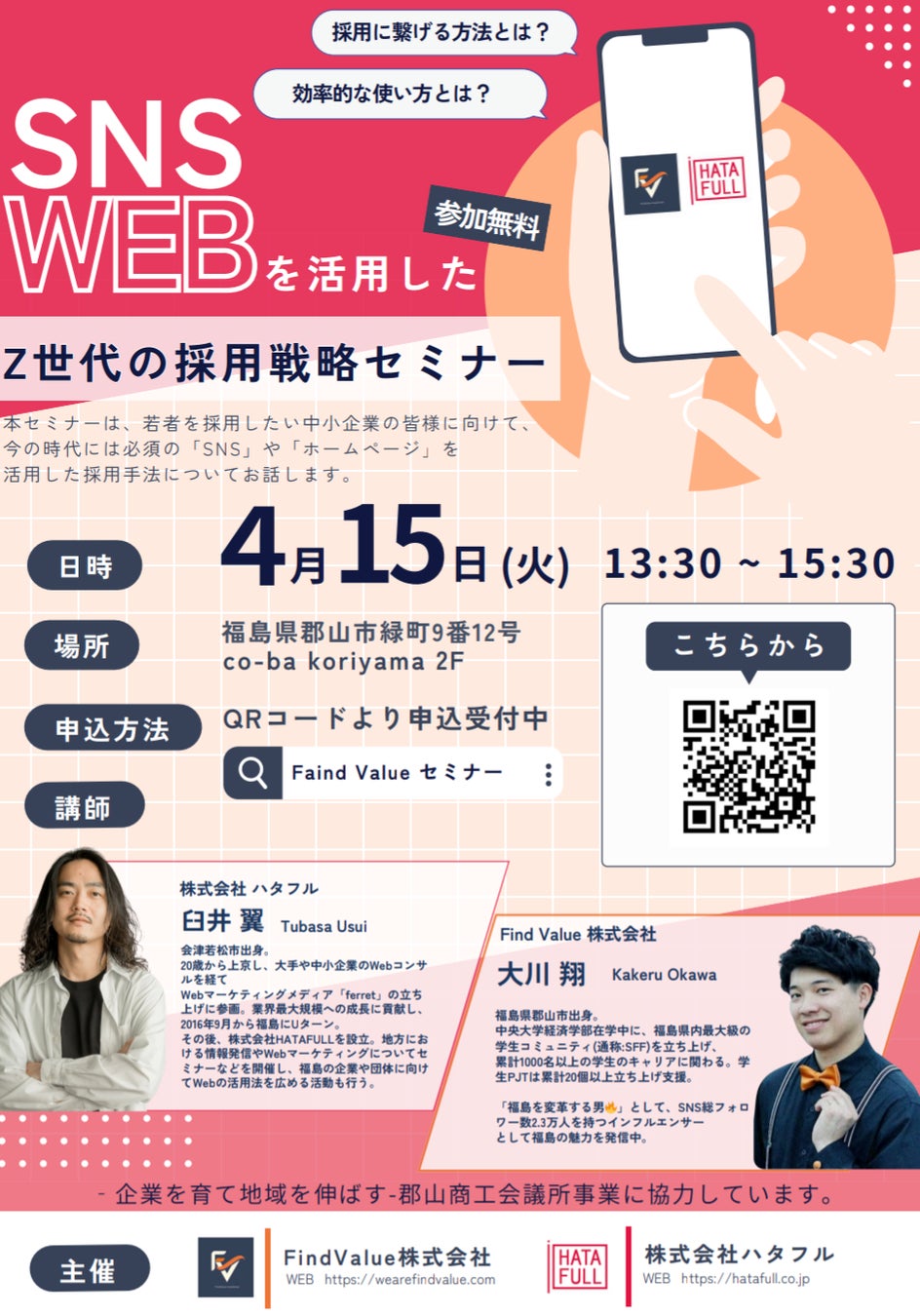 ・内容:本セミナーは、若者を採用したい中小企業の皆様に向けて、今の時代には必須の「SNS」や「ホームページ」を活用した採用手法についてお話します。