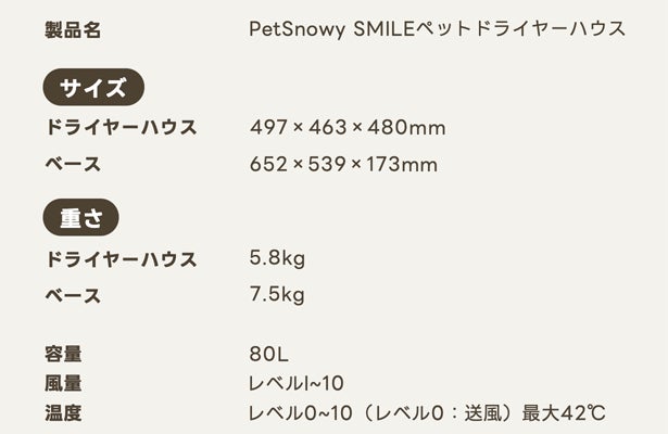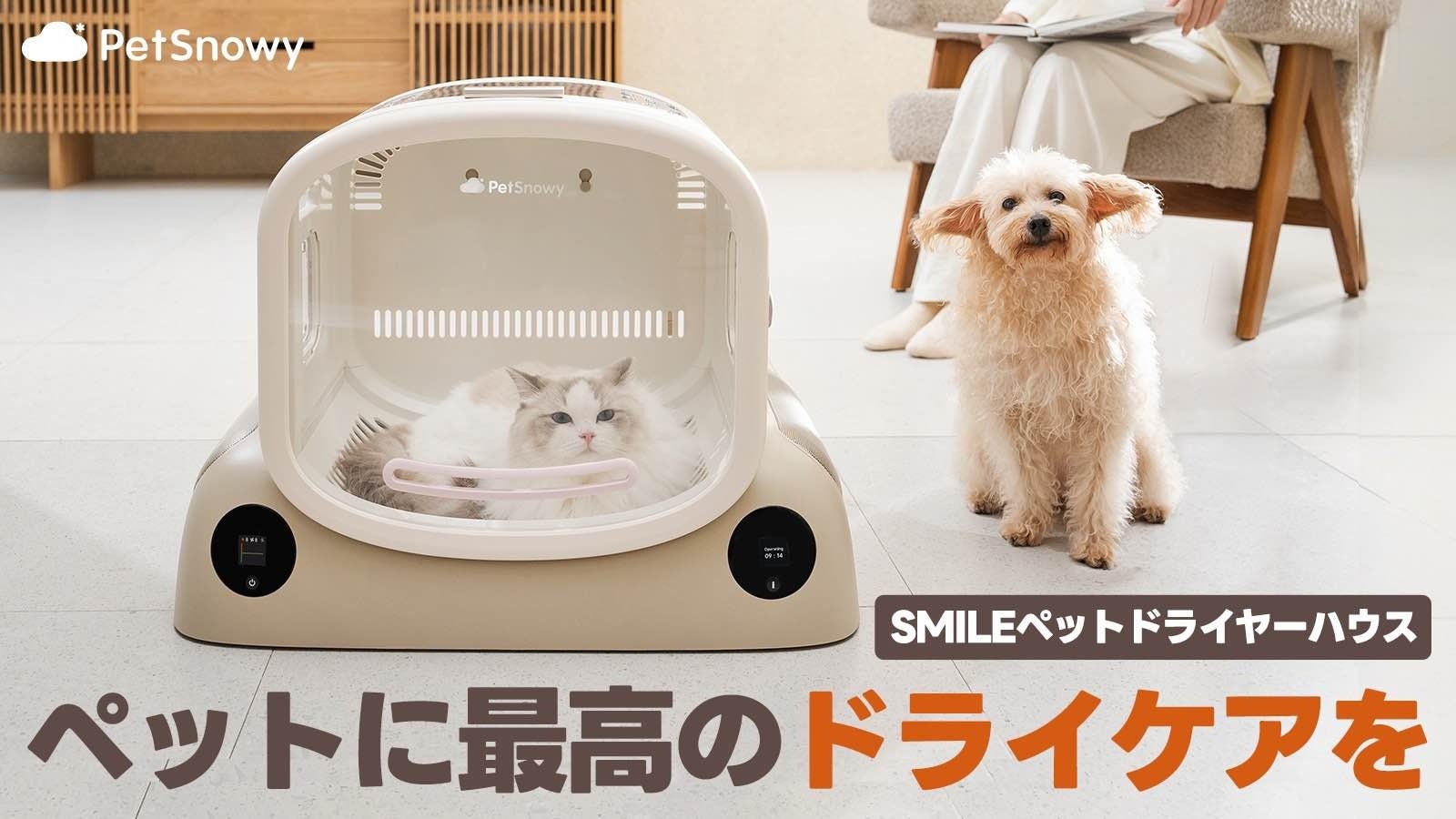 昨年「Makuake」で応援購入総額2,985万円を記録したPetSnowyから、愛犬・愛猫が一年中快適にドライケアできる「SMILEペットドライヤーハウス」が日本初登場!80Lの広々空間で、愛犬・愛猫もくつろぎながら素早く乾かせます。