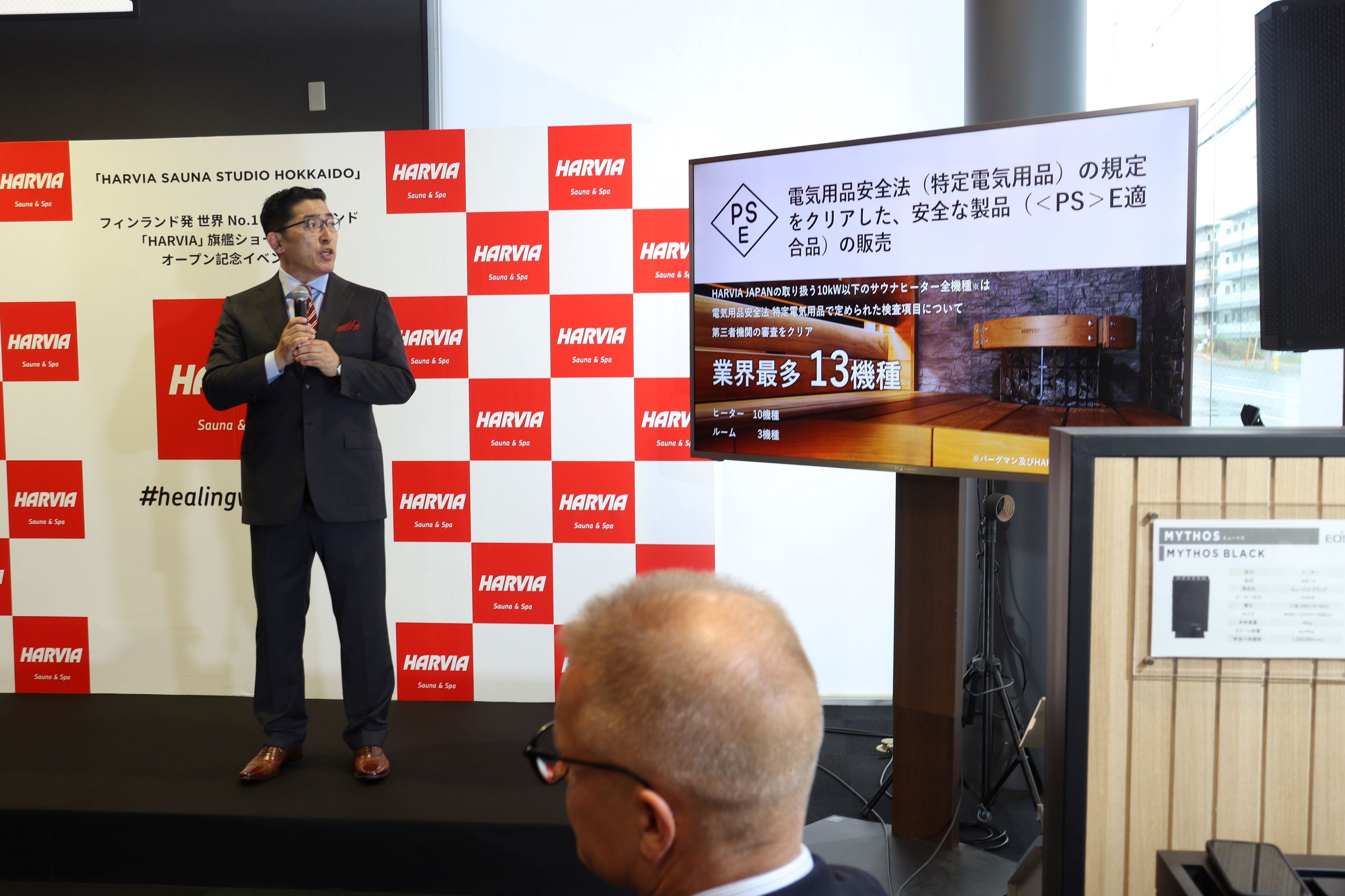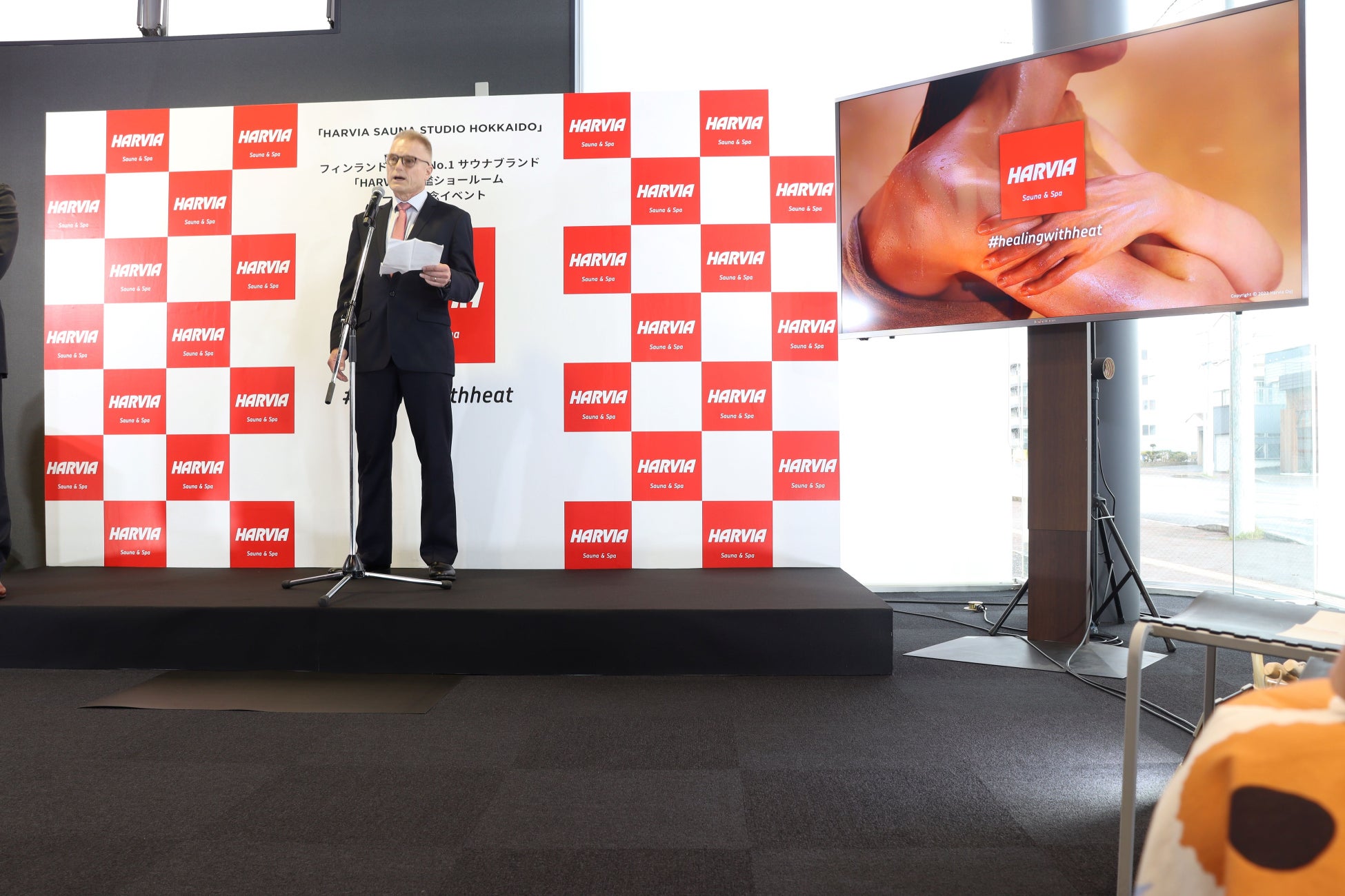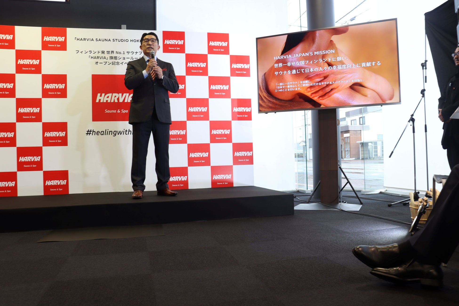 ハルビアジャパンCEOの笠間です。本日は「HARVIA SAUNA STUDIO HOKKAIDO」のオープン記念プレスイベント&ショールーム内覧会にご参加頂きありがとうございます。