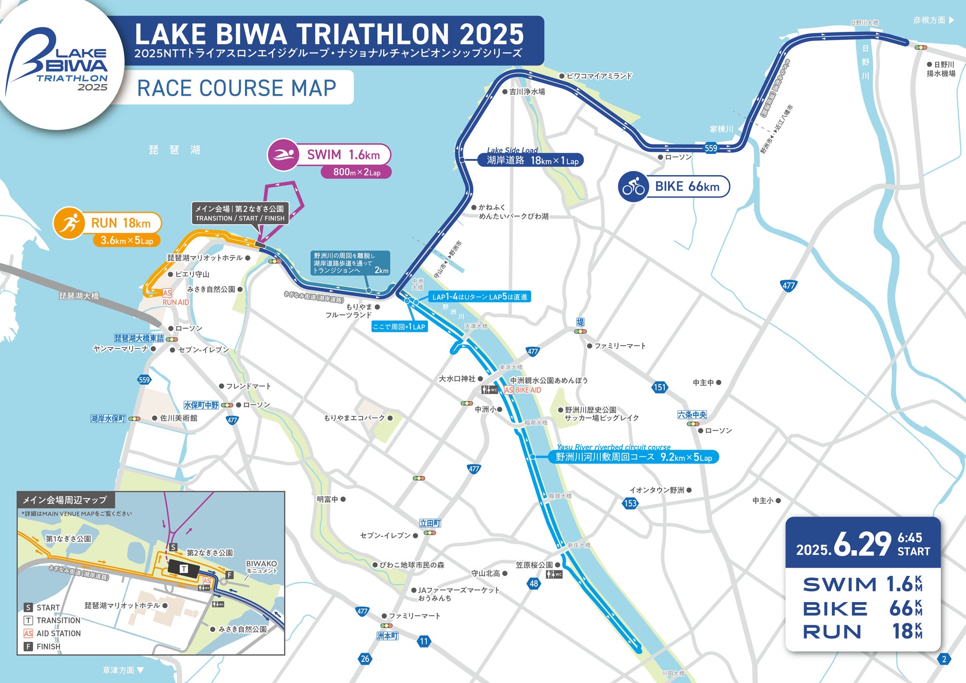 本大会では、日本一の湖・琵琶湖を舞台に、滋賀県守山市・野洲市・近江八幡市をコースとしています。日本のトライアスロンブームの火付け役となった日本最大の湖・琵琶湖での1.6kmのスイムコース、琵琶湖沿いを走る湖岸道路・往復20kmを中心とし、野洲川のフラットな河川敷を周回する66kmのバイクコース、琵琶湖とその奥に比叡の山々を望み、琵琶湖の風を感じながら地域の皆さんの声援に囲まれる18kmのランコースからなる、まさに"This is Biwako"と言えるコースです。