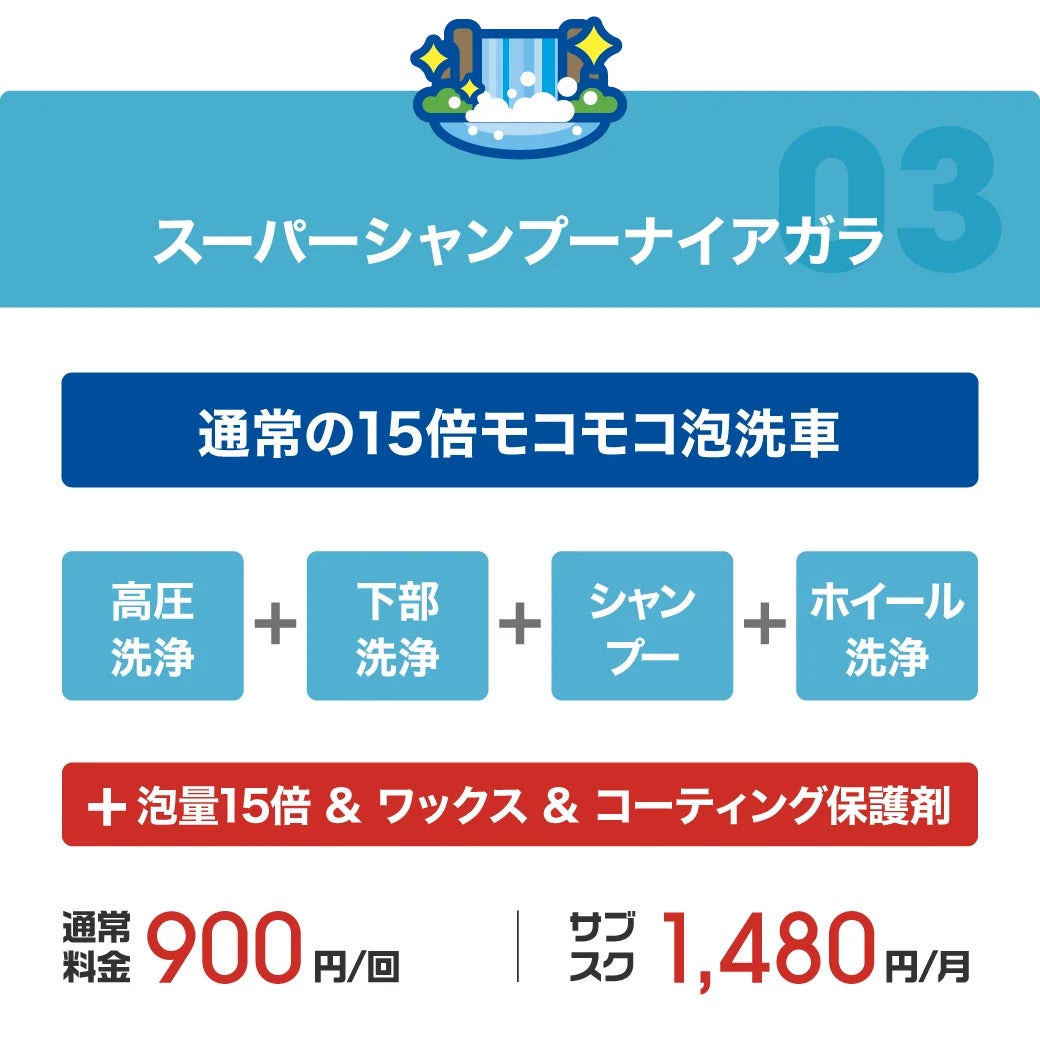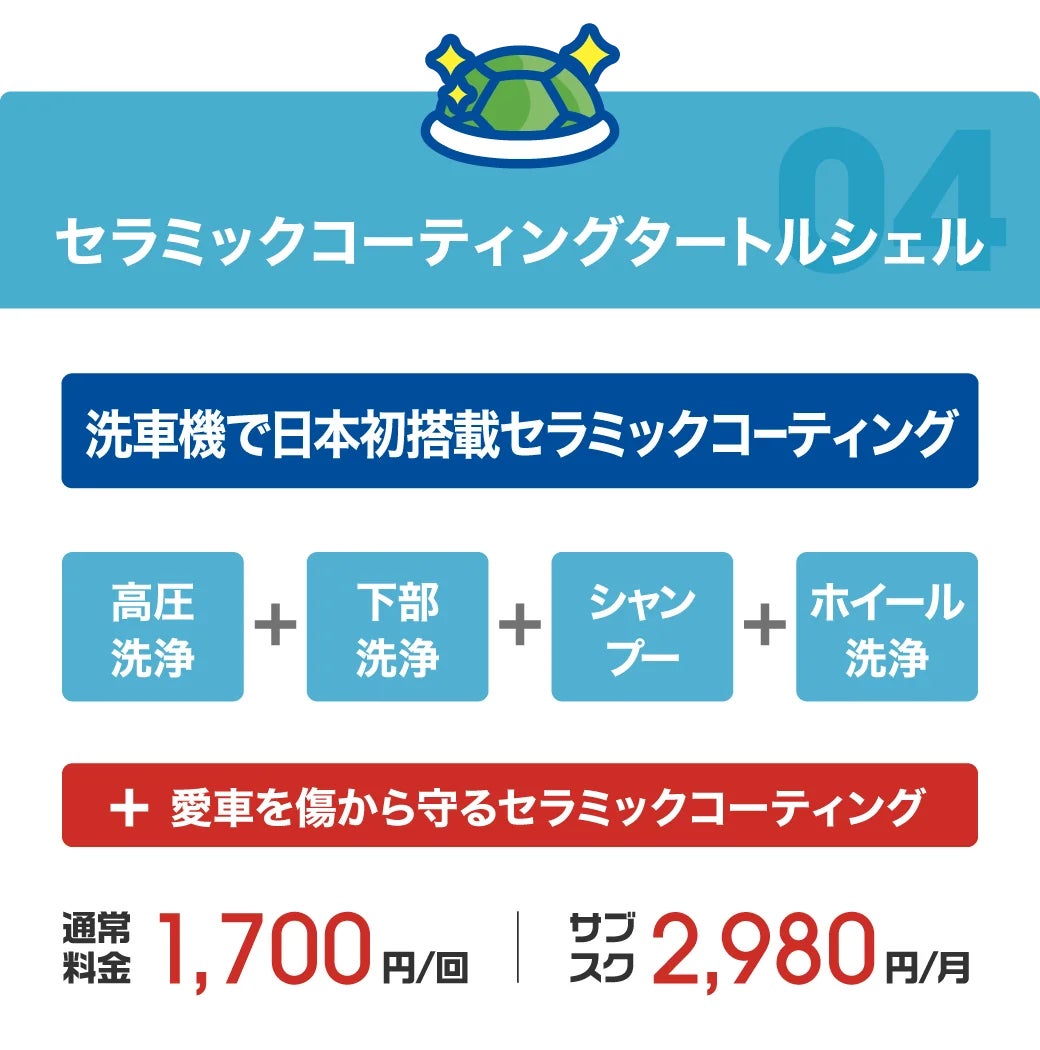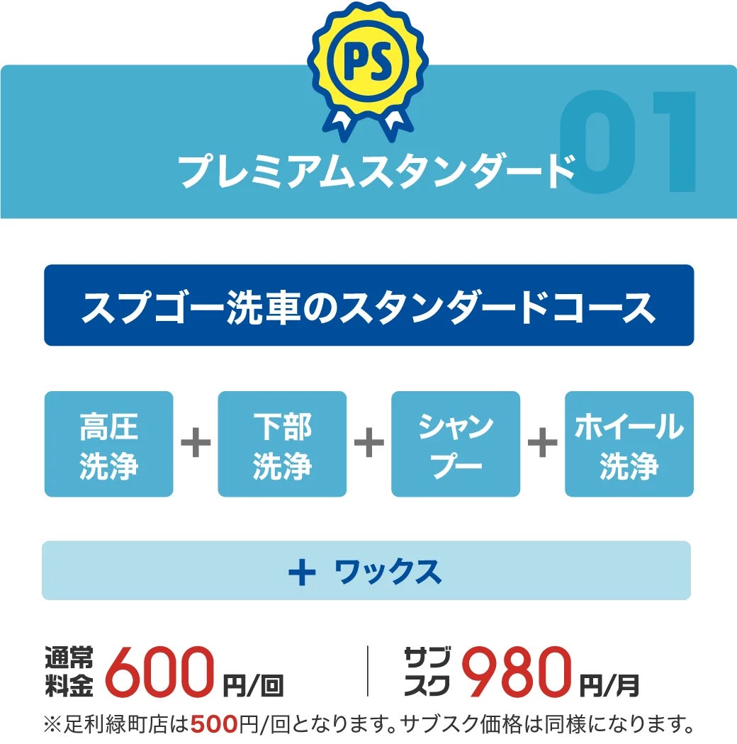 ※スーパーシャンプーナイアガラ、セラミックコーティングタートルシェルは新前橋店と高崎棟高店のみでの提供となります。前橋50号店、伊勢崎韮塚店、足利緑町店では、プレミアムスタンダードとコーティングプラスの2種類のコースをご用意しております。
