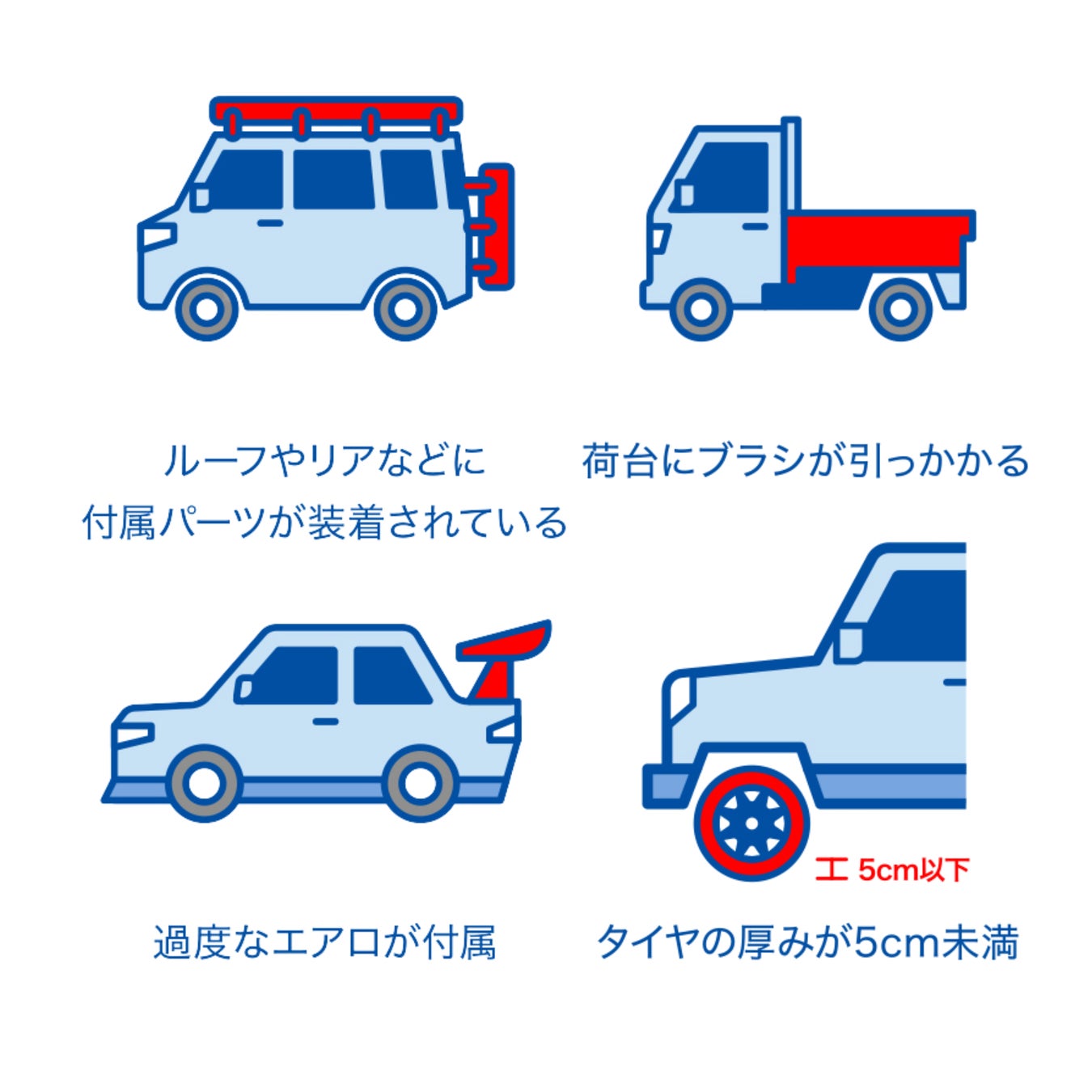 A: 下記のような車両は構造上ご利用いただけません。また、車両の状態によってはスタッフの判断でご利用をお断りする場合がございますので、あらかじめご了承ください。