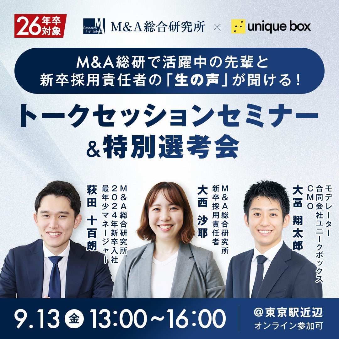 M&A仲介大手のM&A総合研究所とM&A仲介業界への転職支援、就職支援を手掛ける合同会社ユニークボックスが、26卒の就活生向けに特別選考会とトークセッションを開催することが決定しました。