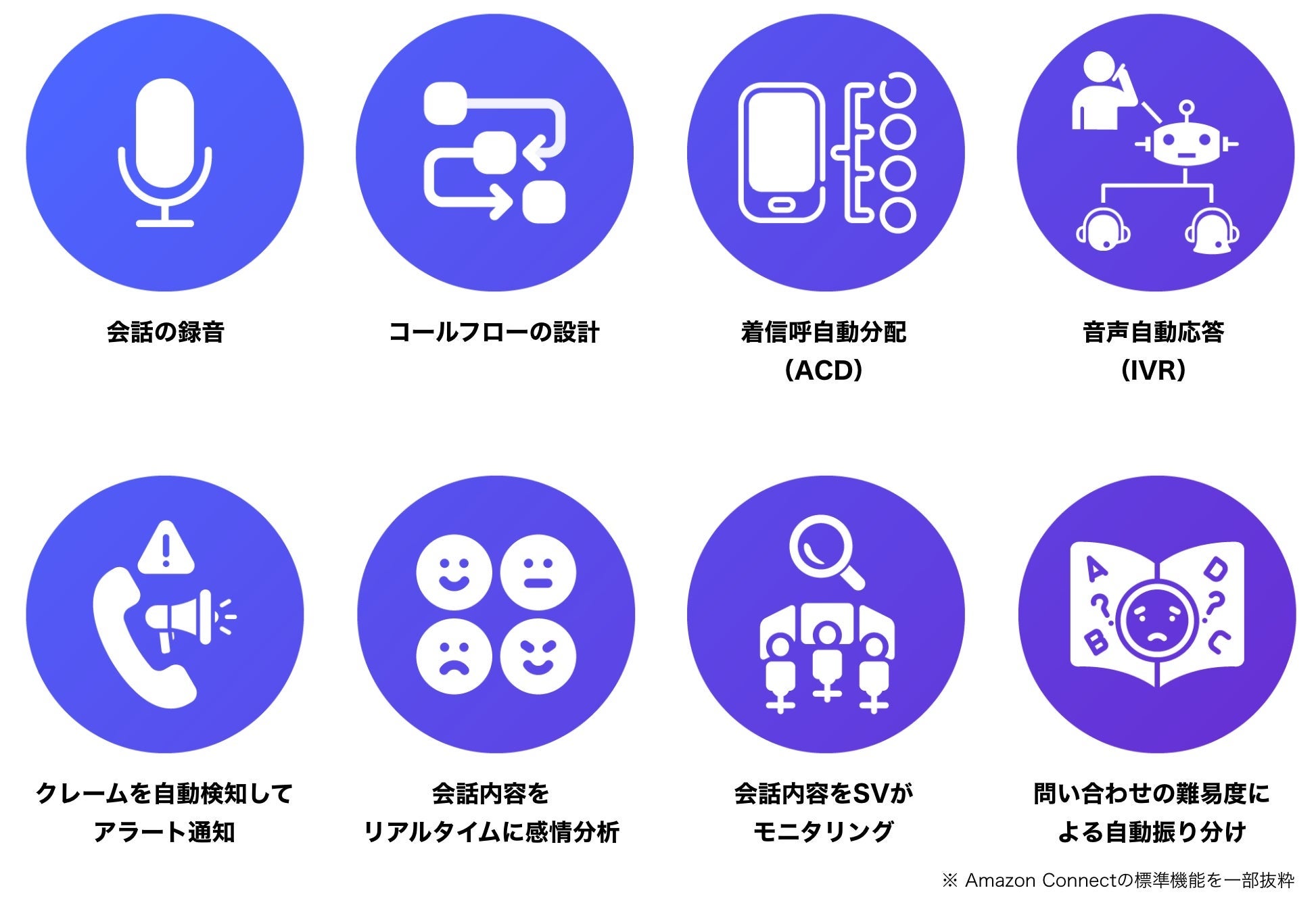 生成AIを活用した通話要約や文字起こし、文字起こし校正、会話議事録生成、顧客管理機能、プレディクティブコール機能、シートマップ機能、パフォーマンス分析機能など、コールセンター運営に必要な機能を豊富に備えています。