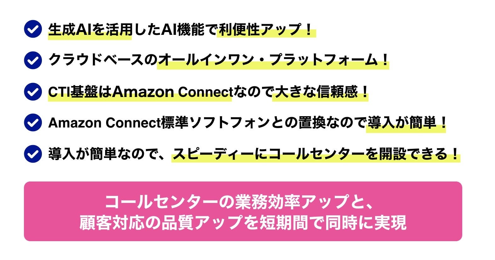 特徴をまとめると、『HARMONY』はAmazon Connectを基盤にしたAIコールセンターシステムで、生成AIを活用することでコールセンターの業務効率アップと顧客対応の品質アップを短期間で同時に実現できます。