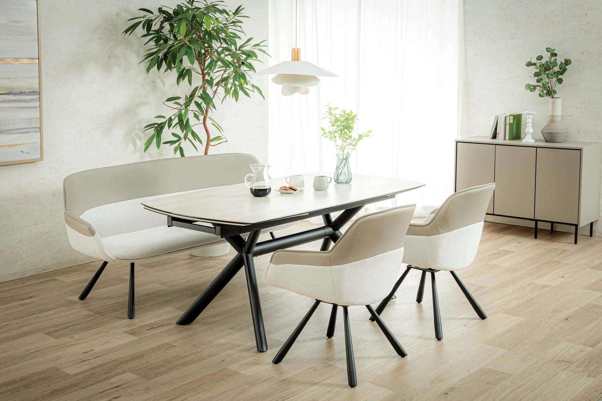 機能性:テーブルは幅160cmから240cmへスムーズに伸長できる仕様。工具いらずで簡単に伸長可能。チェアは回転式を採用し、立ち座りの動作がスムーズに。ベンチは幅が173cmとゆとりがあり、リラックスできる掛け心地を実現。