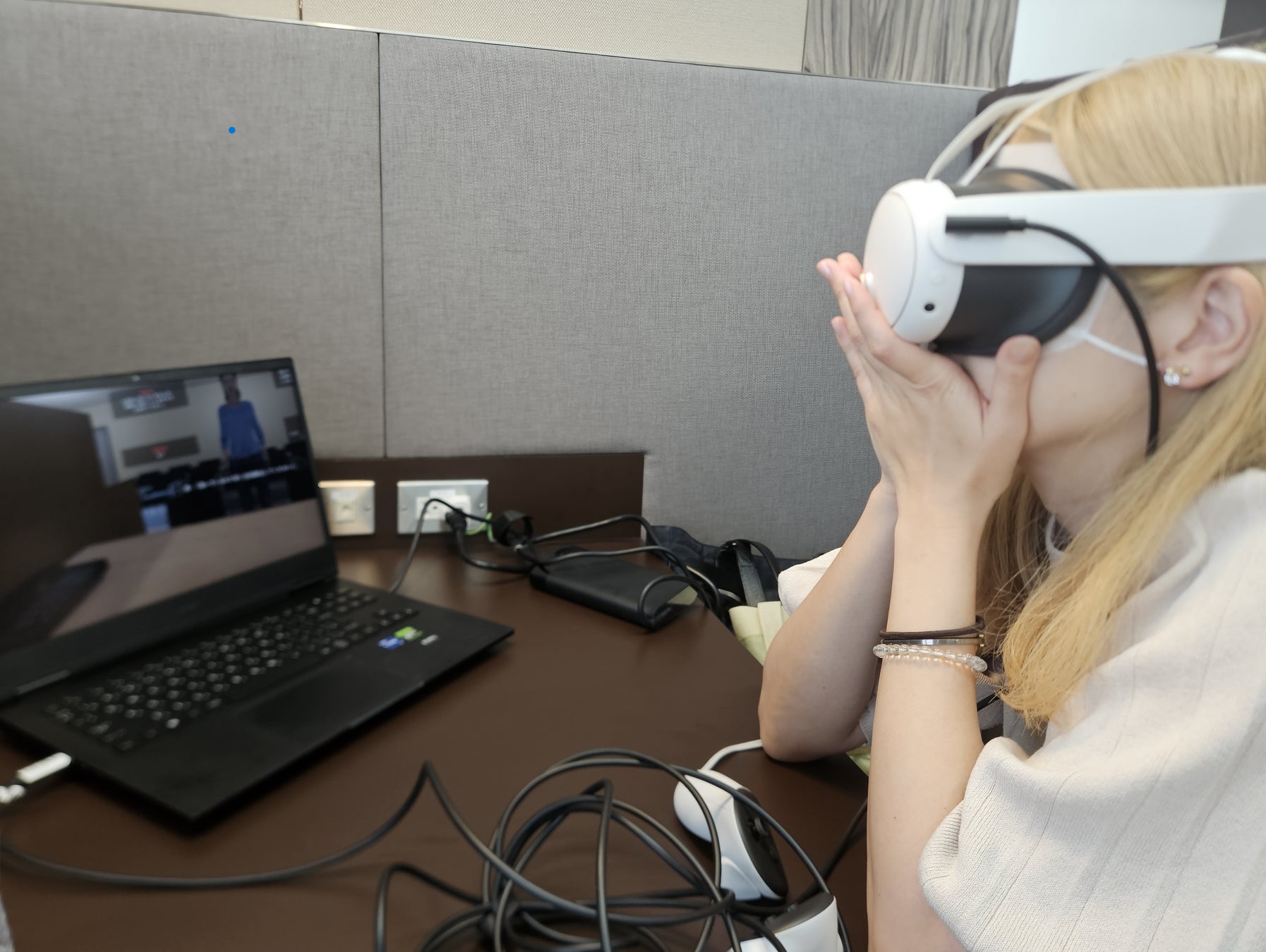 他の受講生は、ゴーグルを被った受講生が体験する様子(ユーザー視点)をモニターで見ることができるため、効率的な研修時間配分の中で参加者全員が疑似体験感覚を共有できます。