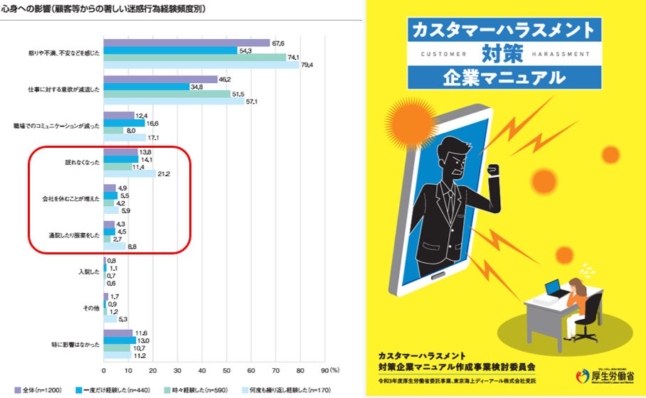 厚生労働省の企業調査(2020年10月)によれば、カスタマーハラスメントの発生が近年増加傾向にあり、パワハラやセクハラに次ぐ第3位の社会問題となっており、被害を受けた企業の割合は19.5%に上ります。何度も繰り返し経験した労働者は「眠れなくなった」(21.2%)、「通院したり服薬した」(8.8%)の回答も見られ深刻です。2022年2月には同省が「カスタマーハラスメント対策企業マニュアル」を公表し、あらゆる業界でカスハラ対策が進んでいます。