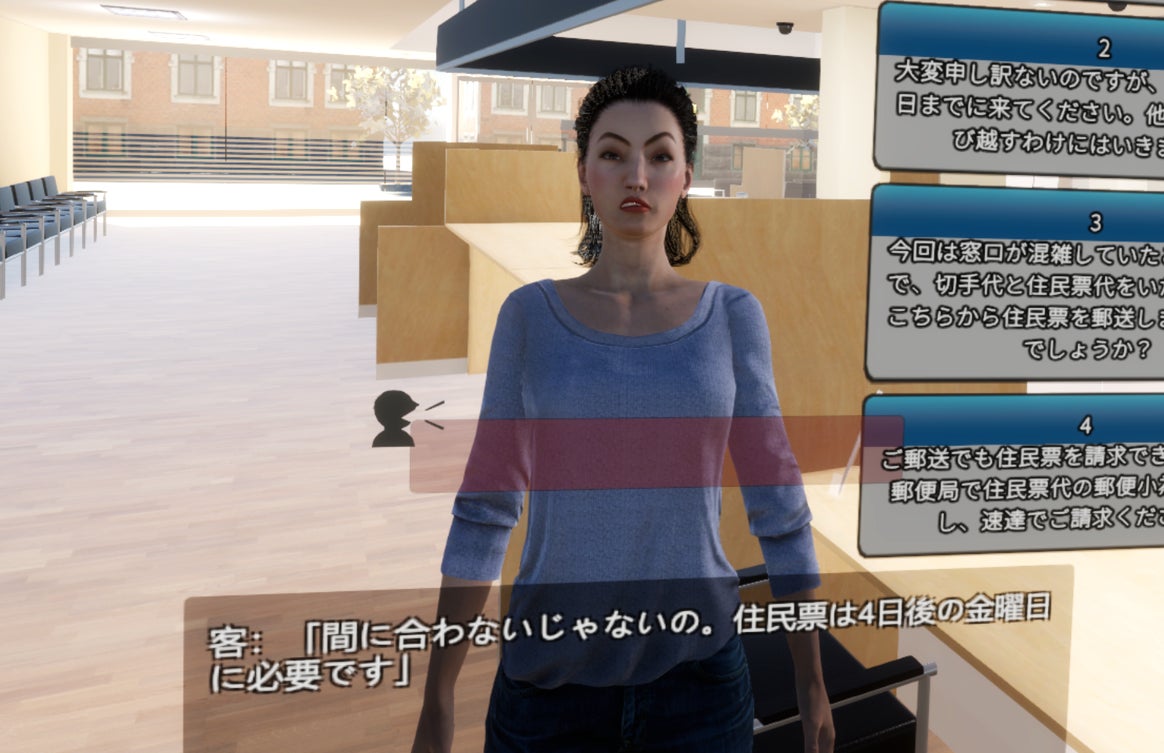 受講生の音声をAIにより認識し、条件分岐によりクレーマーは次のアクション(身振り等+クレーム)を行い、これを繰り返すことで受講生はクレーム対応を疑似体験できます。