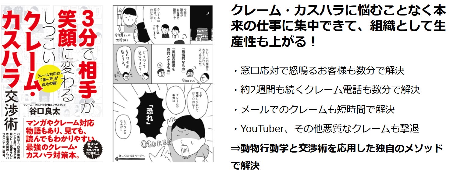 当社代表は、福岡市役所勤務時代に2万件を超えるクレーム対応の経験をもとに、独自のクレーム対応交渉術を習得しました。このノウハウは自治体等へのクレーム対応研修において高く評価されており、これらの経験と知識を集約した書籍『3分で相手が笑顔に変わるしつこいクレーム・カスハラ交渉術』を2025年3月にアルソス株式会社から出版しました。