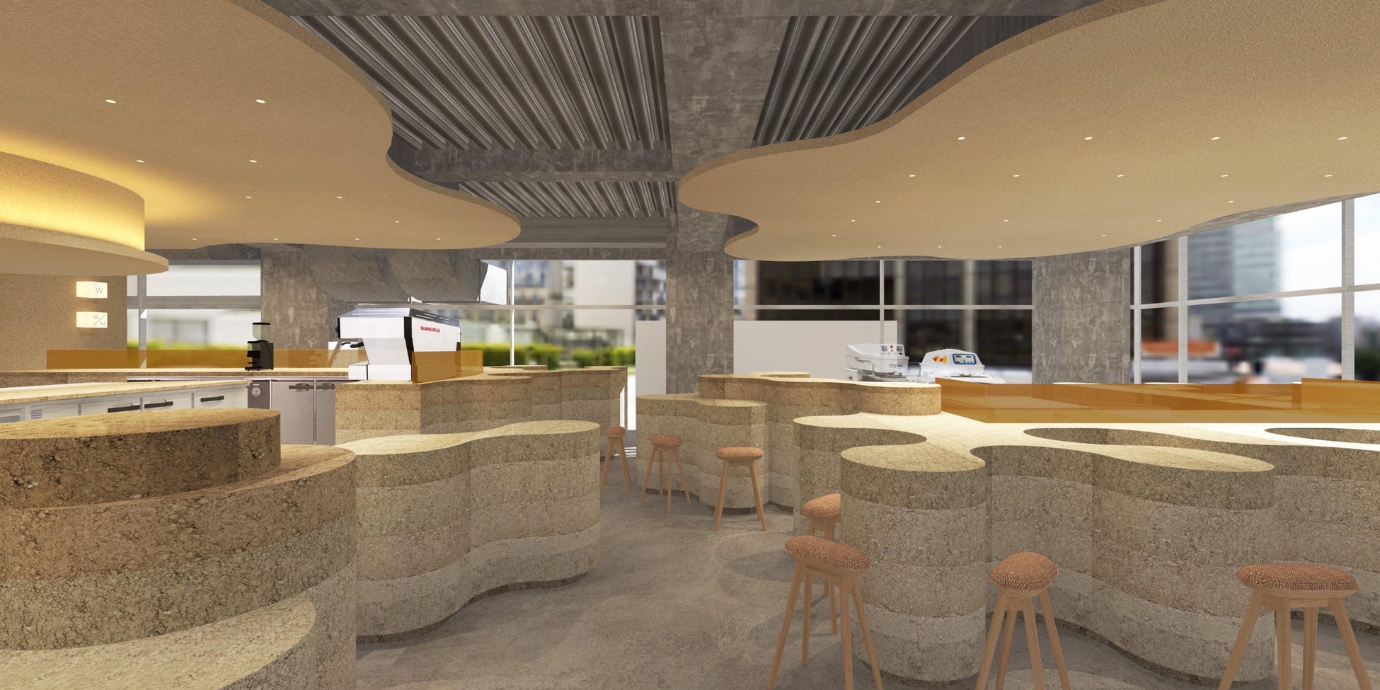 歴史ある街に馴染むようなアースカラーで、地層をイメージしている曲線デザインは、
