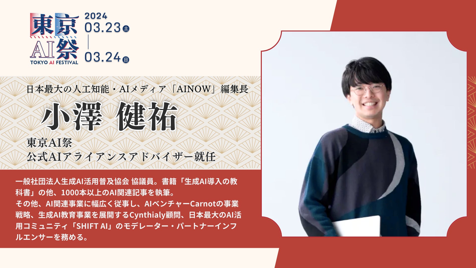 日本最大の人工知能・AIメディア「AINOW」編集長の小澤健祐氏が、生成AIスタートアップカンファレンス「東京AI祭」のAIアライアンスアドバイザーに就任決定