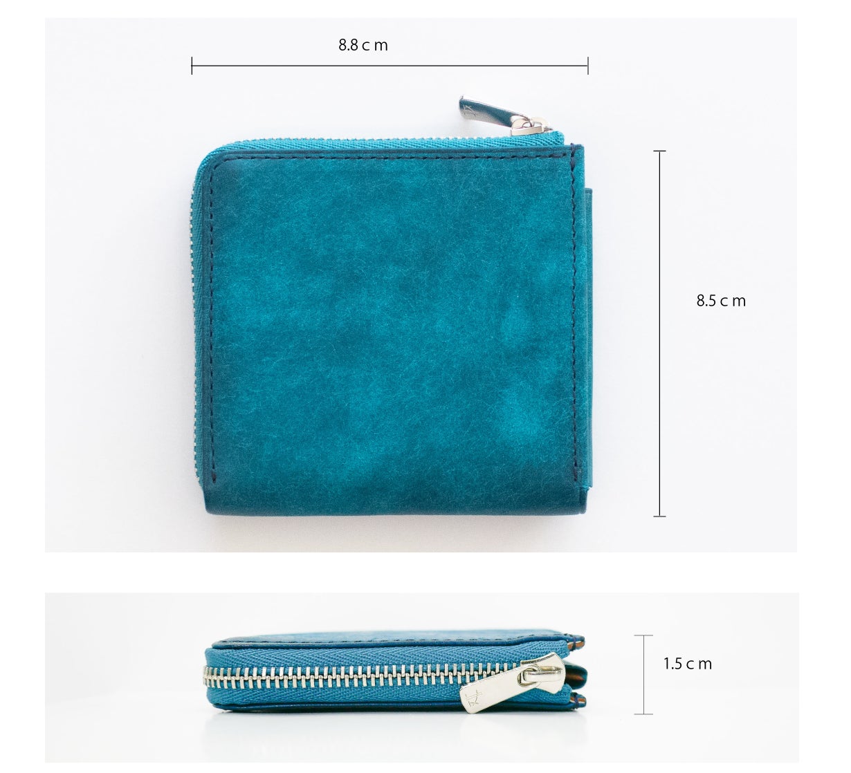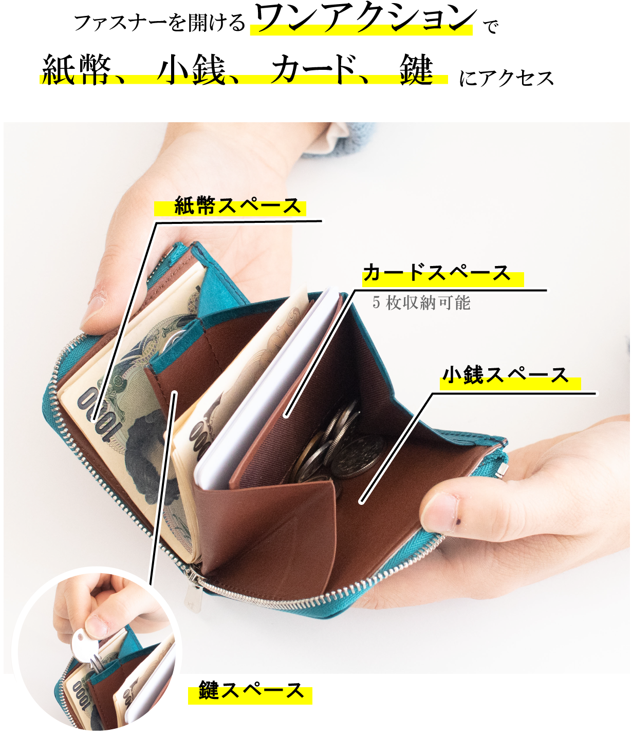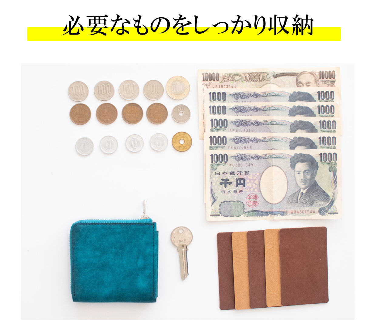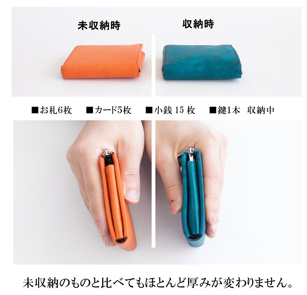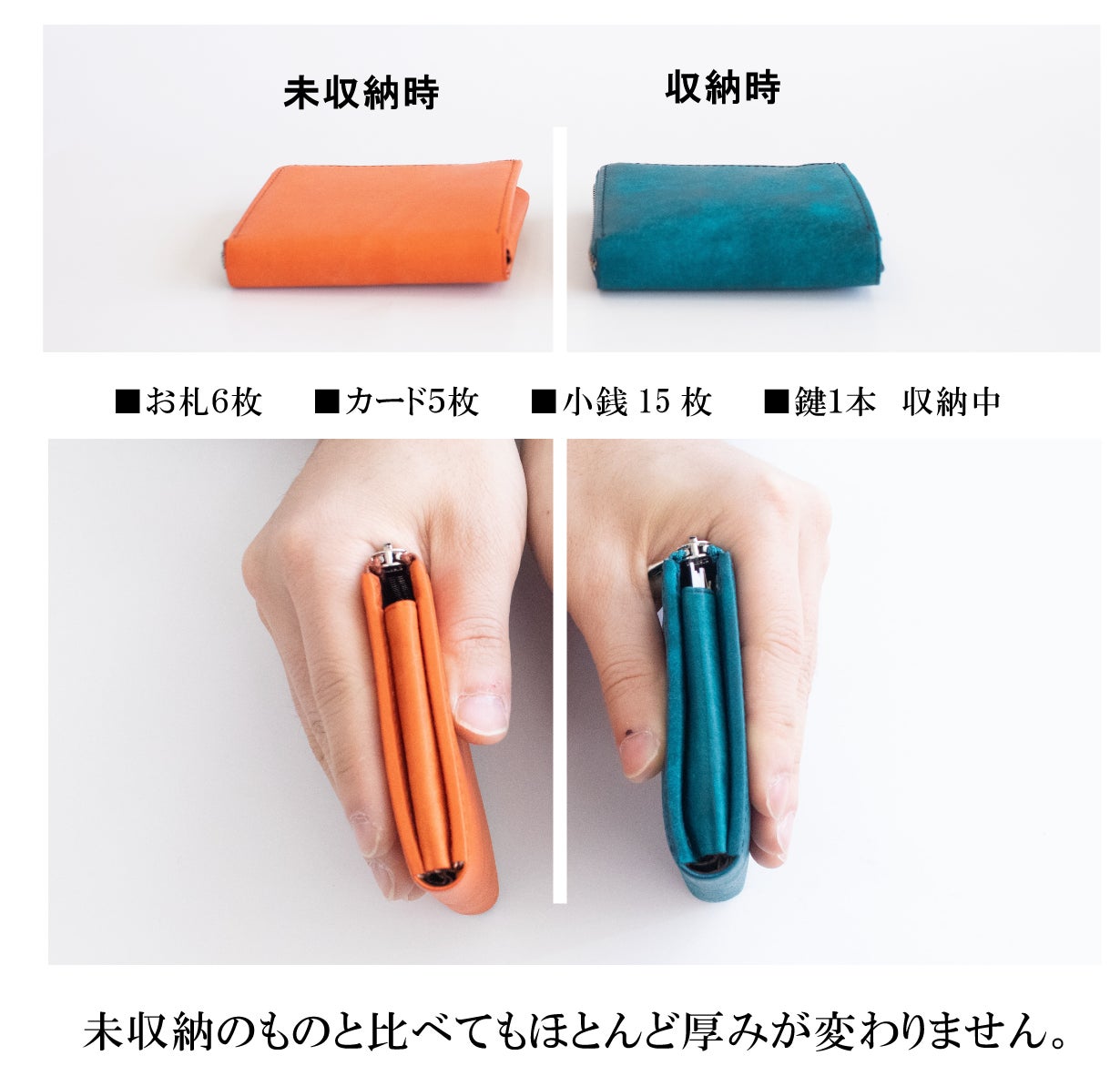 縦8.6㎝、横8.8㎝、幅1.8㎝と、自社従来品の中で最小クラス。それでいて、お札7枚 カード5枚 小銭15枚、鍵1本入って必要量はしっかり確保しております。