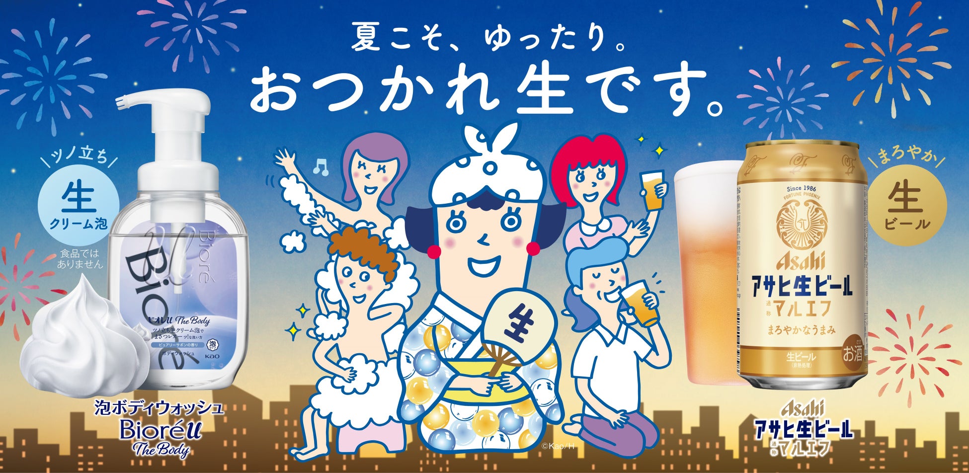 酷暑で汗をかいたカラダには、ビオレu ザ ボディの「ツノ立ち“生”クリーム泡」で自分をいたわるお風呂時間を。一日の終わりには、アサヒ生ビール(通称マルエフ)の「まろやかな“生”ビール」で素敵なくつろぎ時間を。おつかれな夏だからこそ、おうちに帰ったら「ゆったり」過ごしてほしいという想いからコラボに至りました。