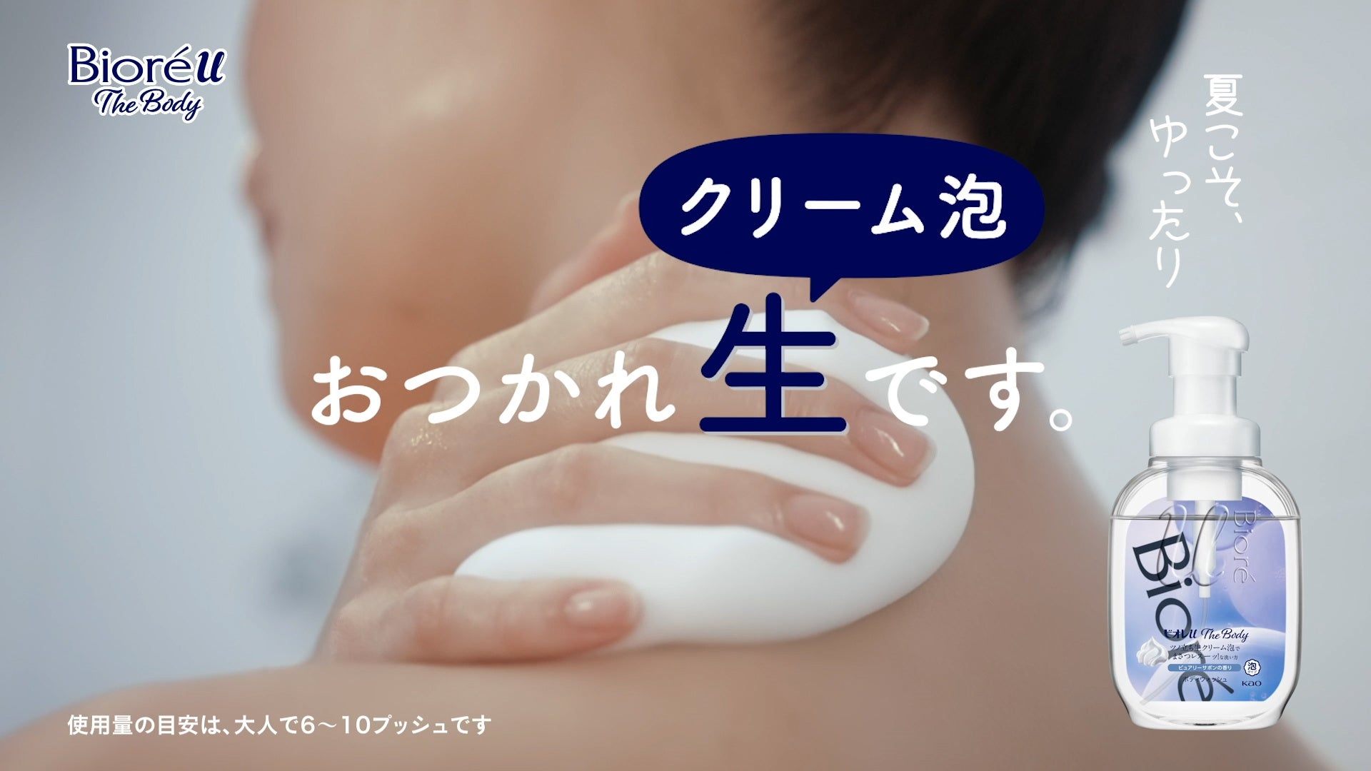 「夏こそ、ゆったり。おつかれ生です。」という本キャンペーンのコンセプトのもと、酷暑の中、汗をかいたカラダをビオレu ザ ボディの「ツノ立ち生クリーム泡」で、気持ちよく洗い流すことを提案する「おつかれ生クリーム泡」篇を公開し、7月15日(月)から交通広告やWEB広告としても放映いたします。