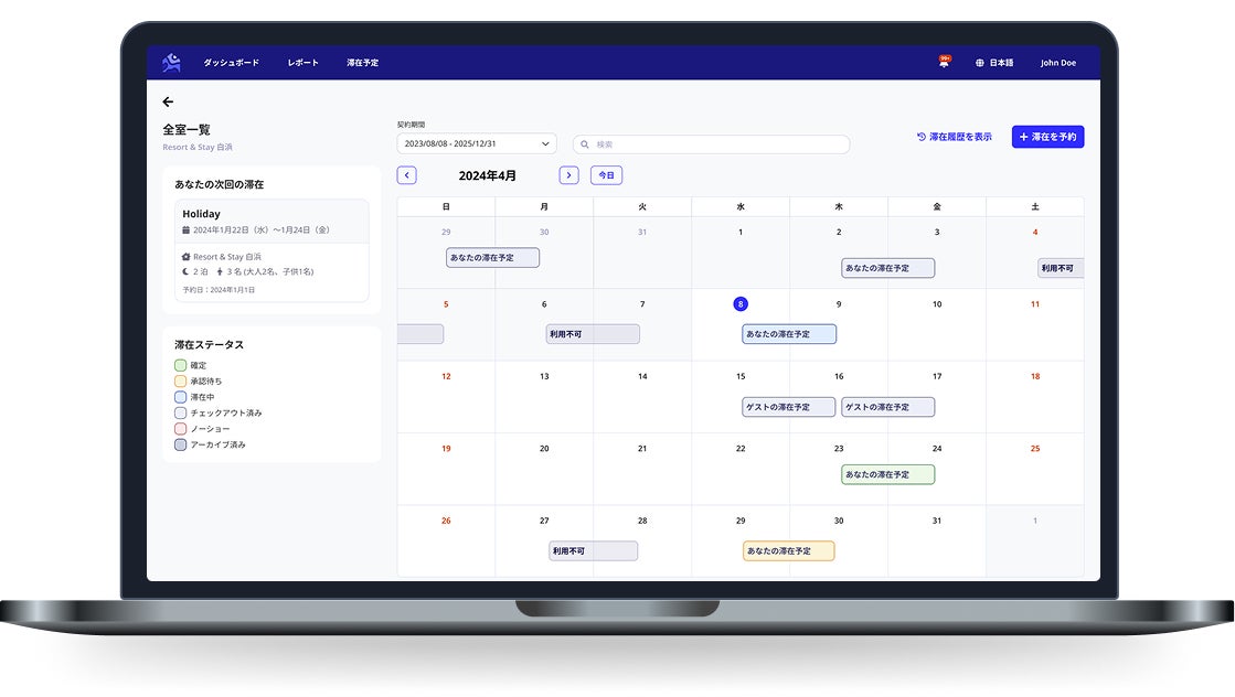 オーナーはポータルから稼働カレンダーを確認し、空き日程で滞在予約が可能