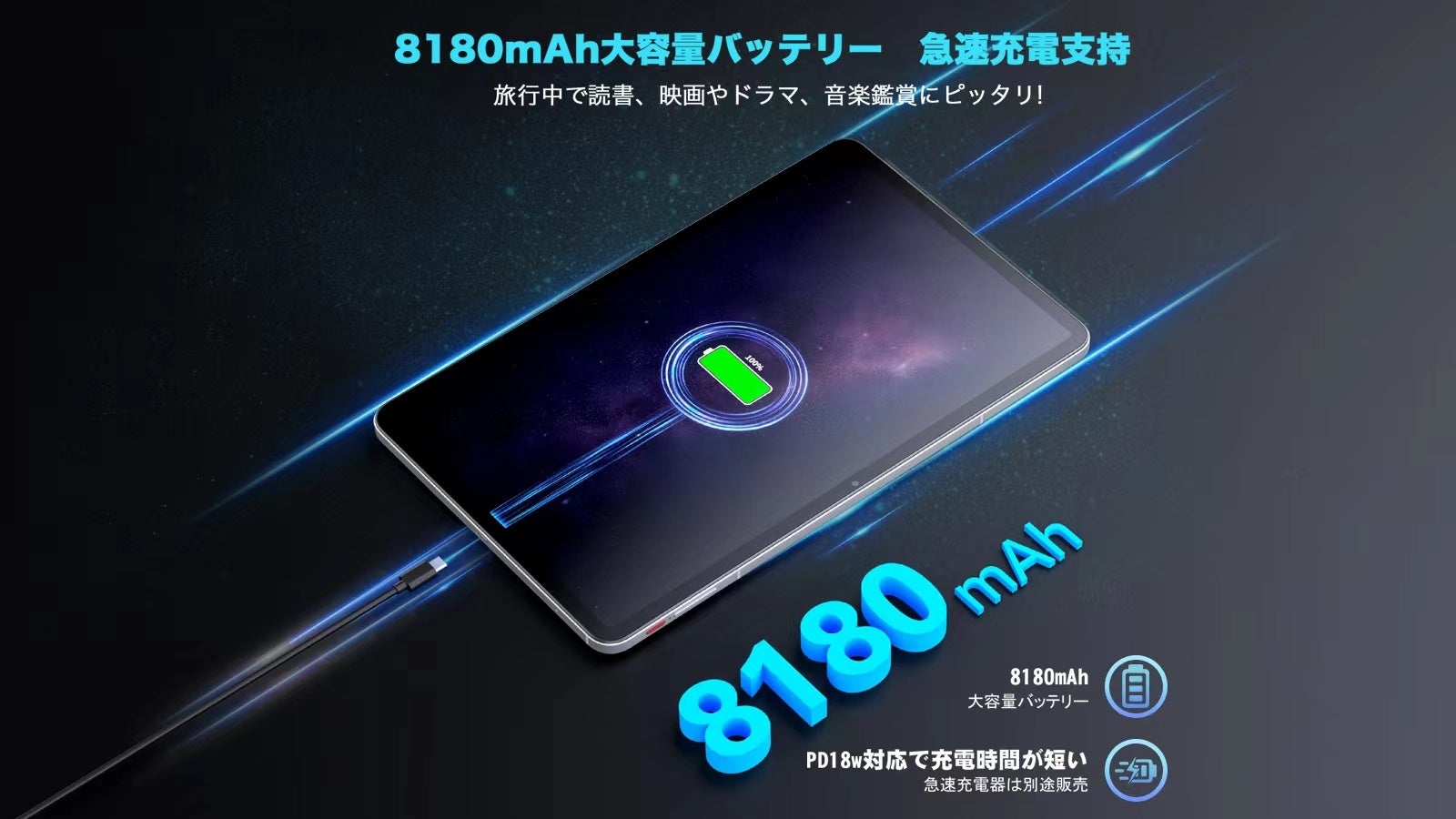 【8180mAhバッテリ・ 光・ジャイロセンサ搭載】AvidPadタブレット A90は8180mAhの大容量バッテリーを搭載しており、長時間の使用でも安心です、PD18W急速充電にも対応しており、急な外出先でも充電がスムーズに行えます。さらに、光センサーを搭載しており、明るさを自動に調整できて目を保護できます。重力センサー、ジャイロセンサ搭載より良いゲーム体験を提供します。汎用的に使用できるタブレット、アンドロイドの世界を楽しもう!
